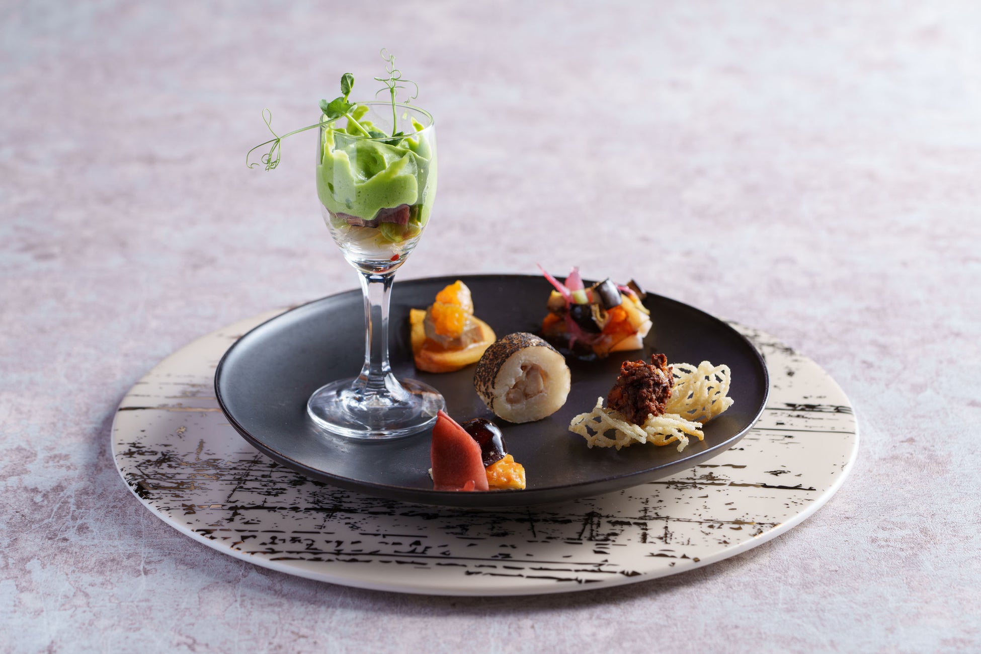 シーズンごとに東北の食材や食文化の魅力にフォーカスしたシグネチャーコース「TOHOKU Gastronomy」。今回は、ひとつのコースで東北6県の食材をまるごと楽しめる全8品を揃えました。アミューズは、青森県産のりんごや、秋田県産比内地鶏、岩手県の名物 盛岡じゃじゃ麺、山形県の郷土料理だし、仙台が誇る牛たんとずんだ、福島県産の柿など、東北各県の名物食材をアレンジした6品が盛り合わせられた豪華な一皿。冷前菜は、黒いダイヤとも呼ばれる青森県の黒マグロをご用意。身が引き締まったマグロの凝縮した味わいを、黒にんにくのペーストが引き立てます。肉料理は、岩手県産短角牛のフィレ肉を高温で一気に焼き上げました。澄んだ空気と水でのびのびと育てられたお肉のジューシーな柔らかさを、同県で採れるアロニアのコンフィチュールとともにお楽しみください。その他、宮城県産鹿肉と“伊達の純粋赤豚”のパテショー、福島県産“阿武隈川メイプルサーモン”のミキュイを浮かべた栗のブルーテ、秋田県産甘鯛の松笠焼き、山形県産洋なしのシブーストなど、東北の恵みを存分にお贈りいたします。