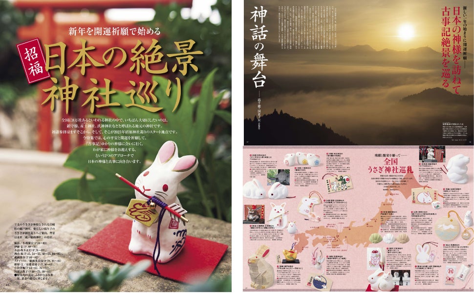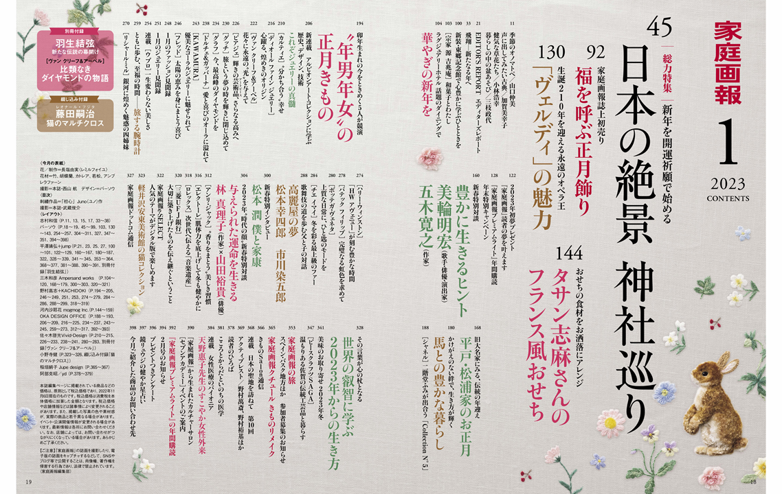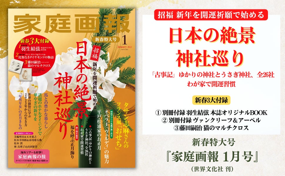 株式会社世界文化社は、新春特大号『家庭画報 2023年1月号』を12月1日(木)(関西・東海・四国地区は11月30日発売)に発売しました。今号では、「新年を開運祈願で始める 日本の絶景 神社巡り」と題し、「古事記」ゆかりの神社とうさぎ神社、全26社をご紹介するなど、2023年の幕開けにふさわしい内容でお届けします。また松本潤さん、松本幸四郎さん&市川染五郎さん親子、山田裕貴さんほか、いま話題の方々が登場。さらに特別付録として ①「羽生結弦オリジナルBOOK」、②「別冊付録 ヴァン クリーフ&アーペル」、③「藤田嗣治 猫のマルチクロス」(※③は通常サイズ版のみ)がついています。(※予約殺到のため『家庭画報2023年1月号』プレミアムライト版は、発売前重版を行いました)