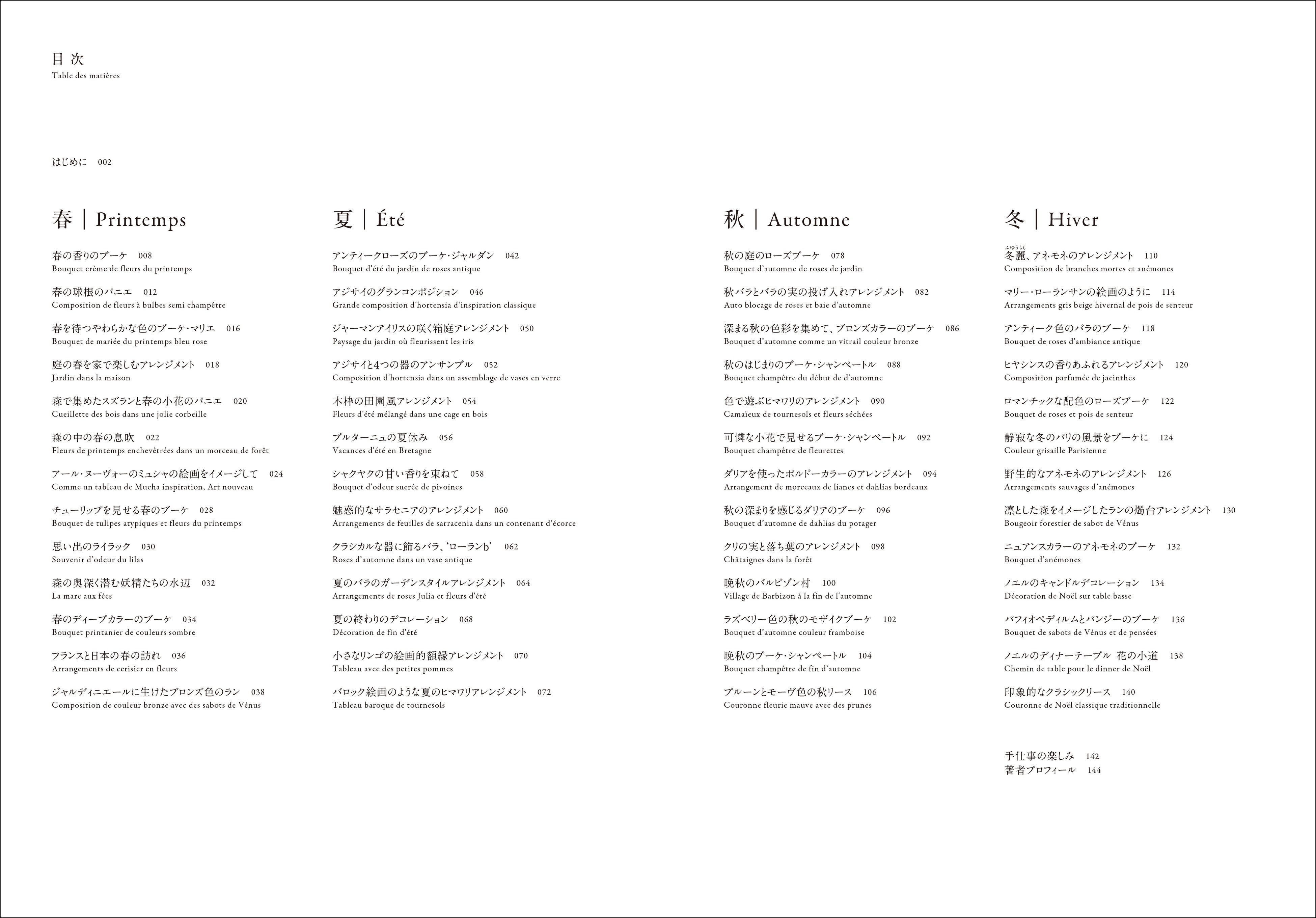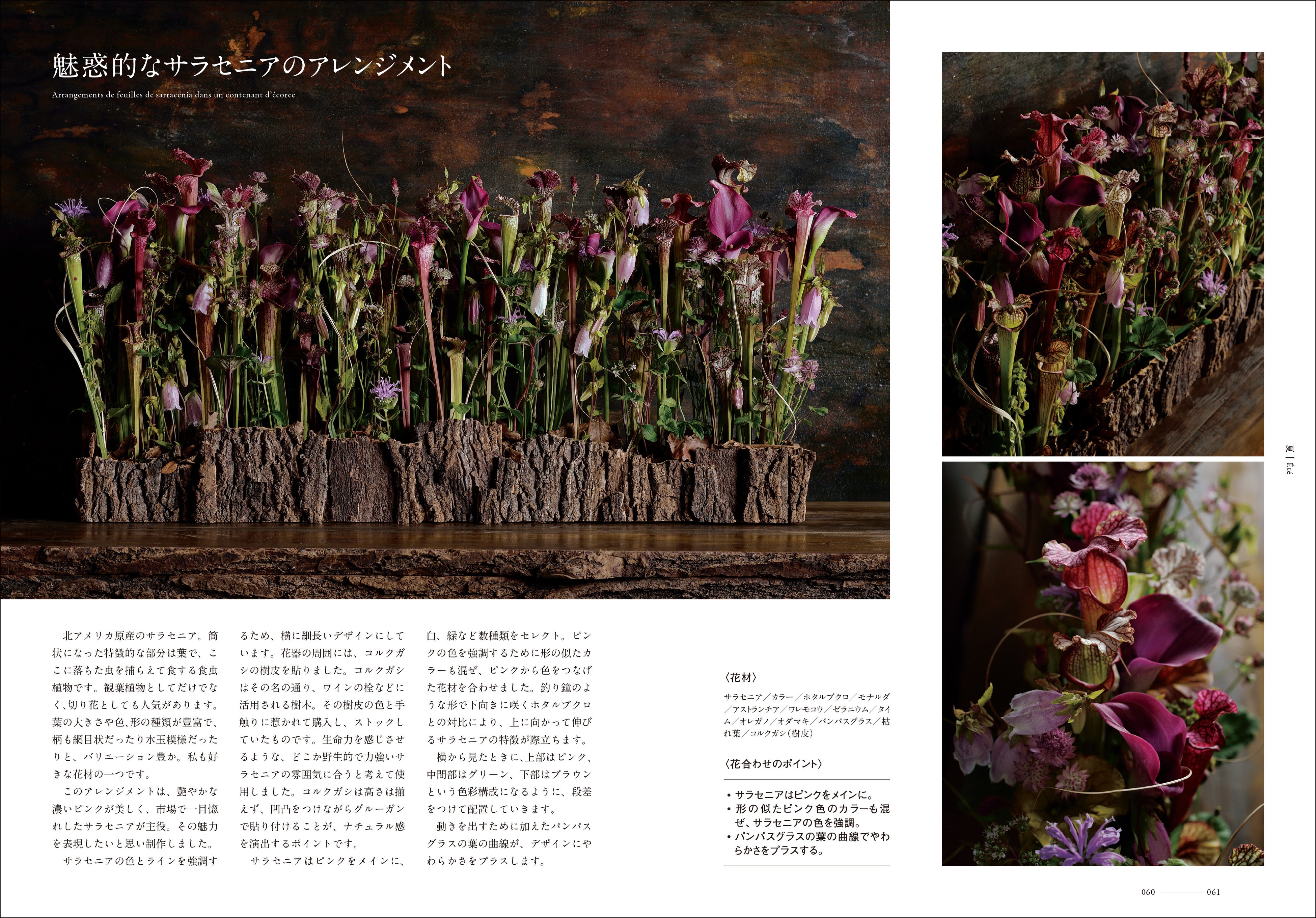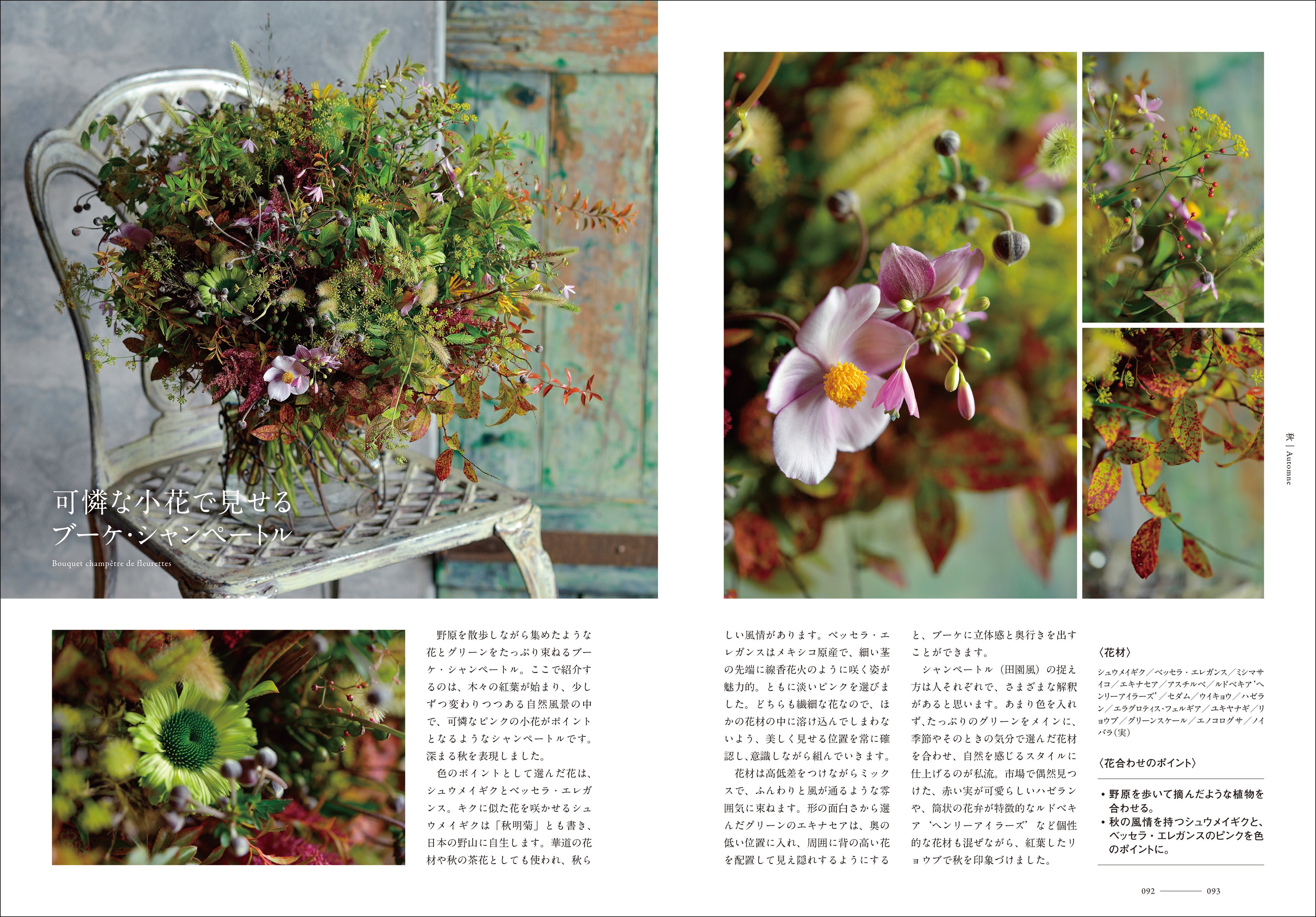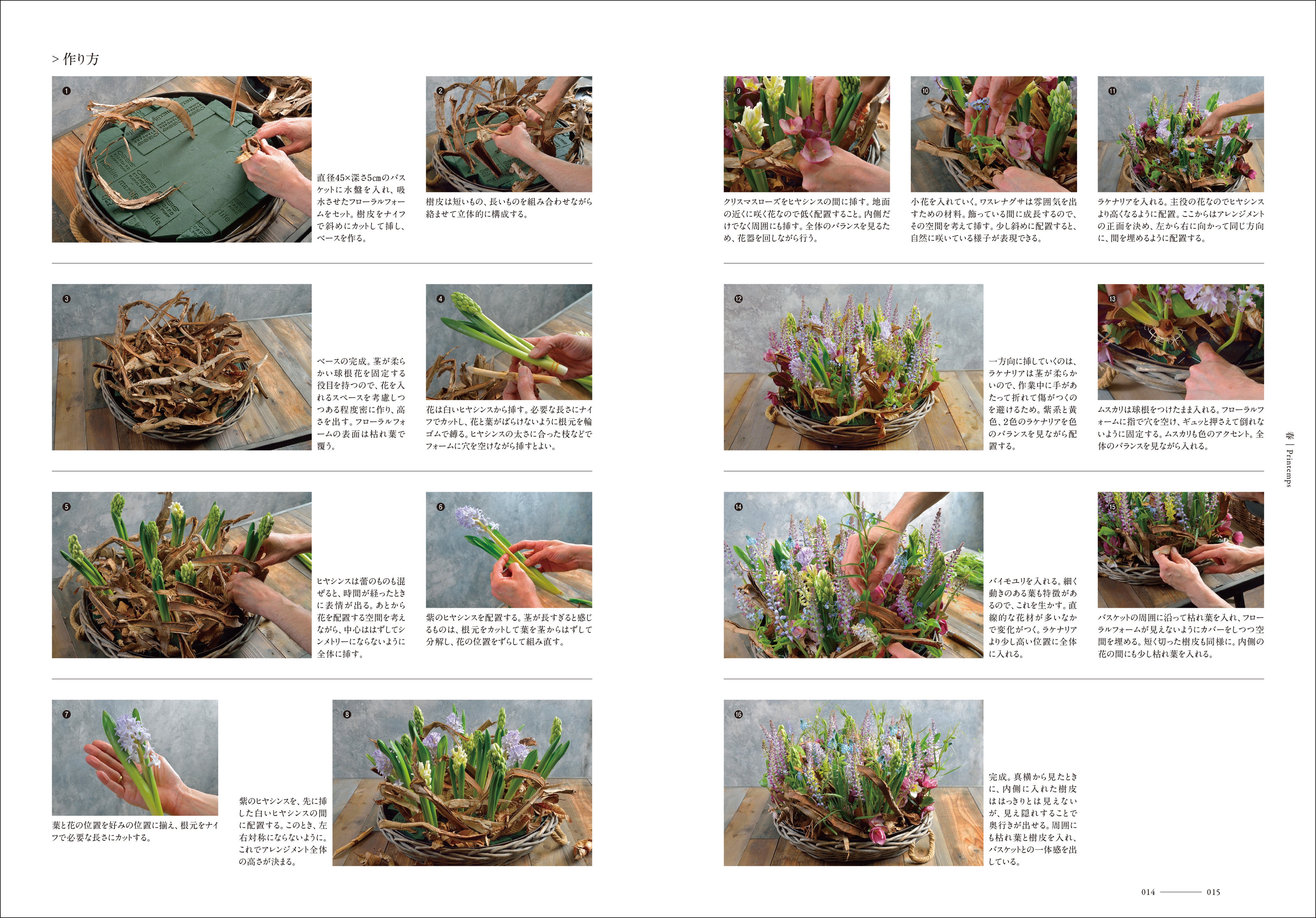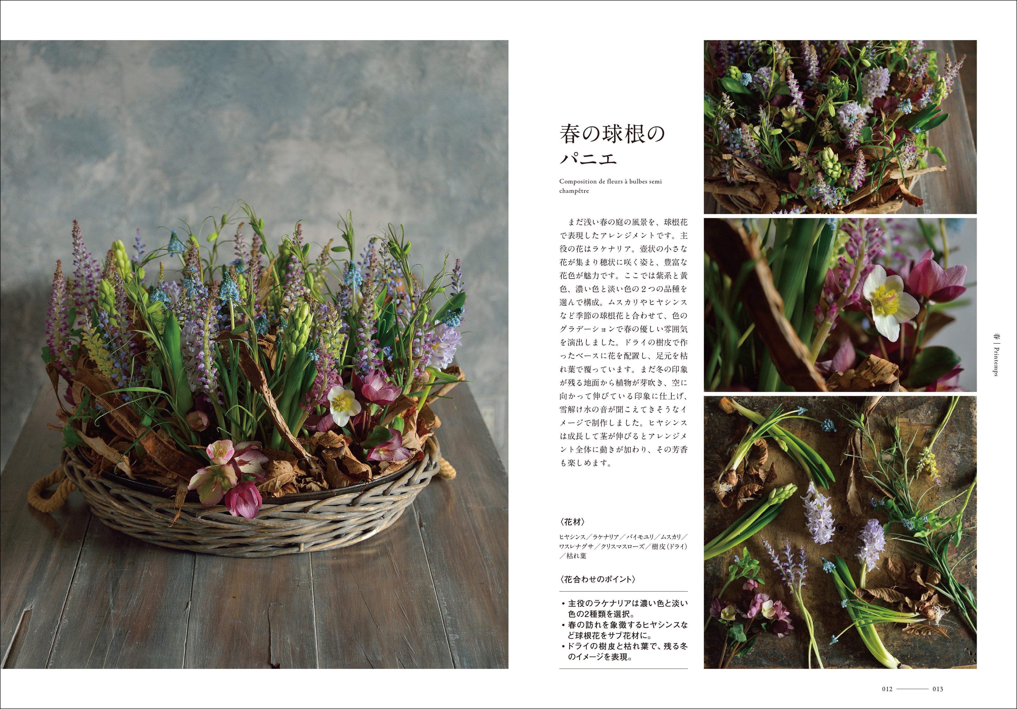 ウェブサイト「植物生活×フローリスト」の連載「ローラン流 季節の花あそび」をベースに、旬の花材を用いた作品を季節ごとに13点、合計52点掲載。