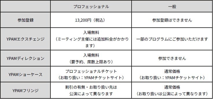 YPAM(ワイパム、横浜国際舞台芸術ミーティング、Yokohama International Performing Arts Meeting)は、同時代の舞台芸術に取り組む国内外のプロフェッショナルが、公演プログラムやミーティングを通じて交流し、舞台芸術の創造・普及・活性化のための情報・インスピレーション・ネットワークを得る場です。1995年に「芸術見本市(Tokyo Performing Arts Market、TPAM)」として東京で開始、2015年からはアジア・フォーカスを強化し、アジアとの共同製作にも参画。今回で30年目を迎え、アジアで最も影響力のある舞台芸術プラットフォームのひとつとして国際的に認知されています。職業的目的に特化した一部のプログラムを除き、ほとんどのプログラムは一般のお客様にもご参加いただけます。
