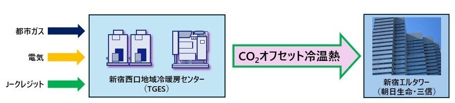 TGESが運営する新宿西口地域冷暖房センターでは冷熱・温熱を製造し、エルタワーをはじめ、オフィスビル、学校など8箇所へ冷熱・温熱を供給しています。本取り組みは、エルタワーの年間熱使用量に対応するCO₂排出量[*2](年間約2,000tを見込む)を、TGESが調達する省エネルギー由来のJ-クレジット[*3](以下「J-クレジット」)によって全量オフセットするものです。本取り組みを通じ、朝日生命と三信は、地球温暖化対策の推進に関する法律(温対法)に基づく「温室効果ガス排出量算定・報告・公表制度」(SHK制度)において、エルタワーにおける熱使用に伴う温室効果ガス排出量を、調整後排出係数がゼロの熱として報告することができます。なお、TGESが運営する都市部の地域冷暖房事業における「熱のカーボンニュートラル化」としては、本取り組みが初の事例となります。