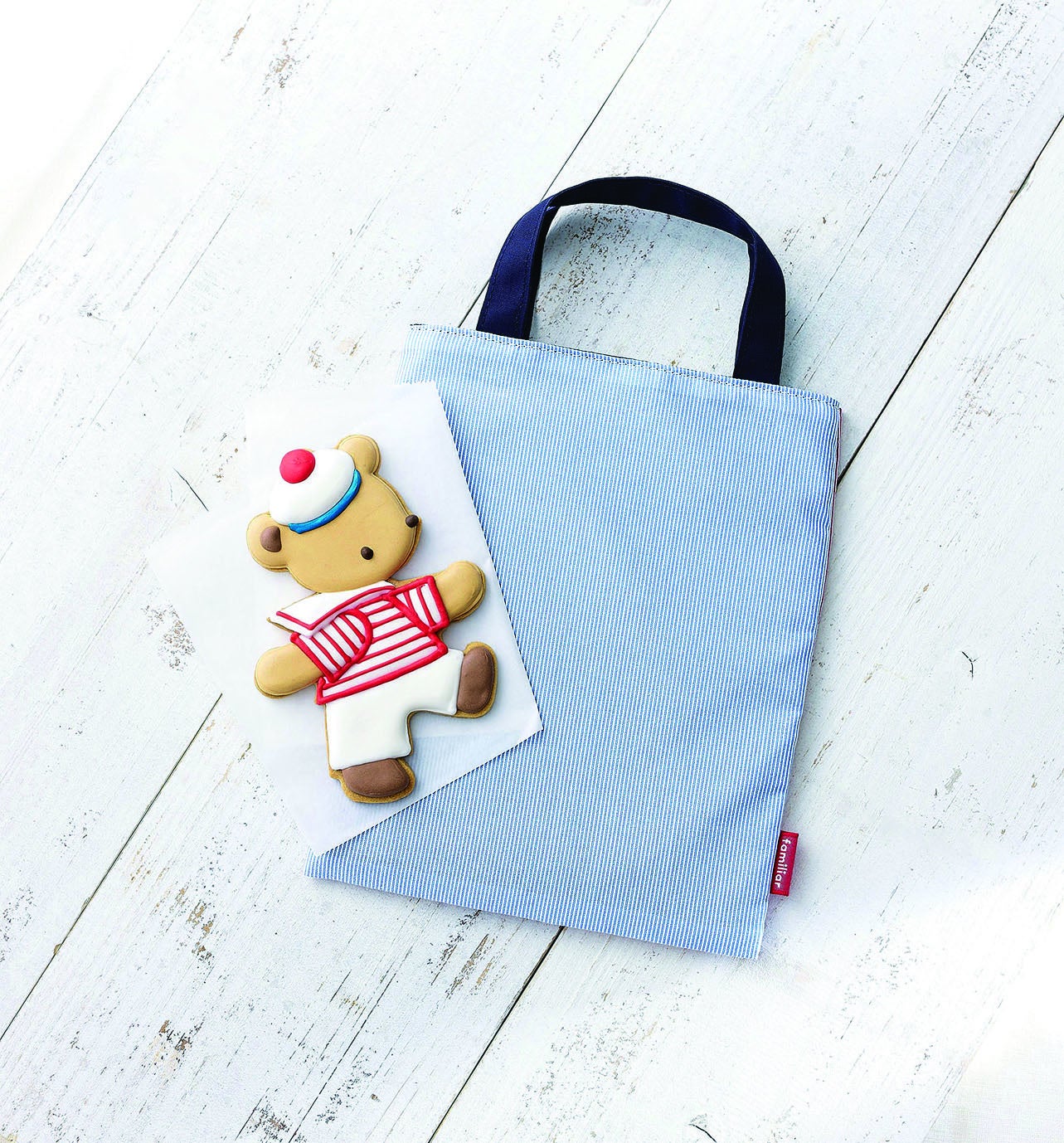 表はブルー、裏はレッドのストライプ柄。マリンスタイルなクマのアイシングクッキーとセットになった、