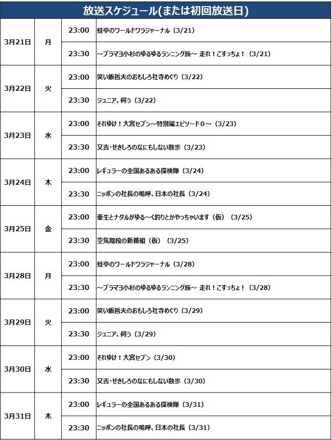 月曜~金曜、23時~24時までの1時間、曜日ごとに毎日30分×2本のオリジナルバラエティ番組を放送します。全国で活躍するよしもと芸人が、それぞれ特徴ある企画を通して日本の夜を笑いでいっぱいにします!
