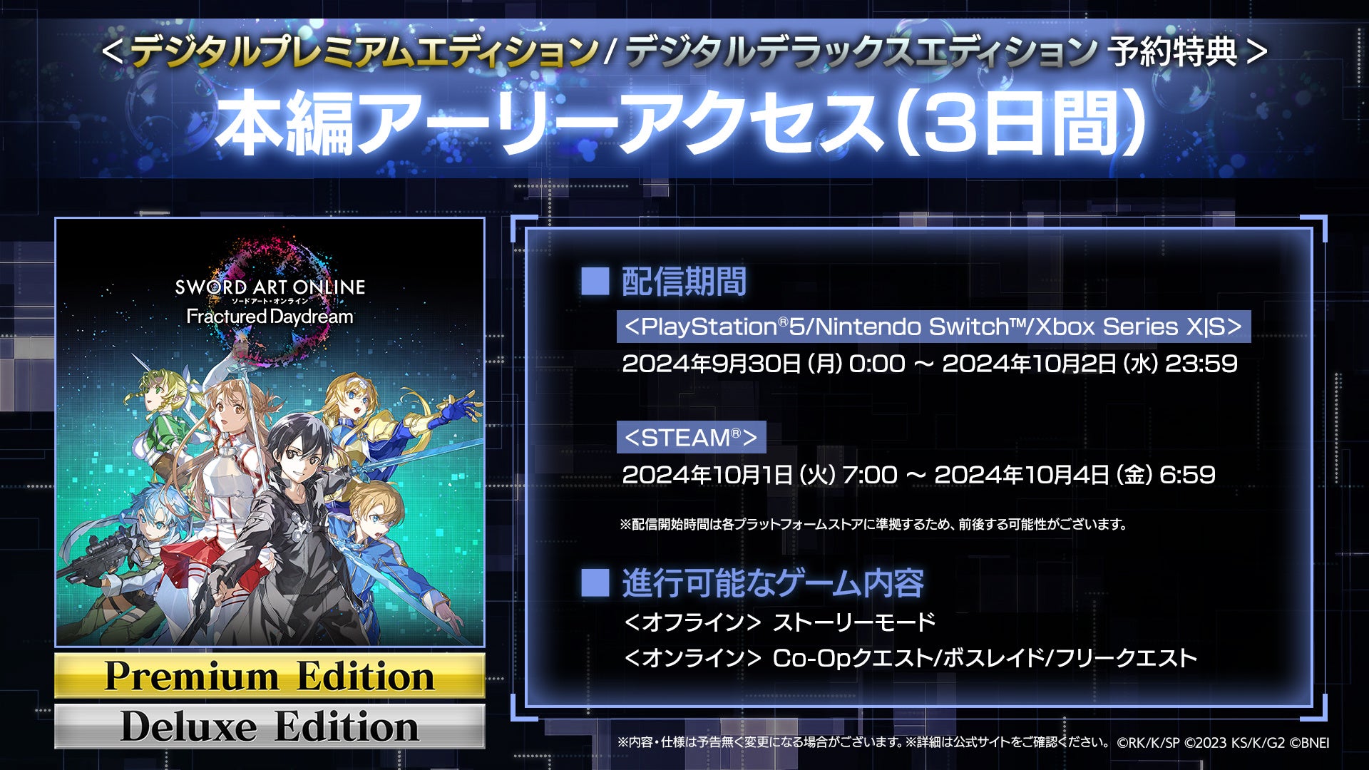 【出展内容】『ソードアート・オンライン フラクチュアード デイドリーム』をご予約いただいた方限定で、オリジナルノベルティがもらえるキャンペーンを実施いたします。ご予約を証明できるもの(注文メール、レシートなど)、及び身分証明書をお持ちの上、「TGS2024」のバンダイナムコエンターテインメントブースへお越しの方にノベルティをランダムでプレゼントいたします。 |