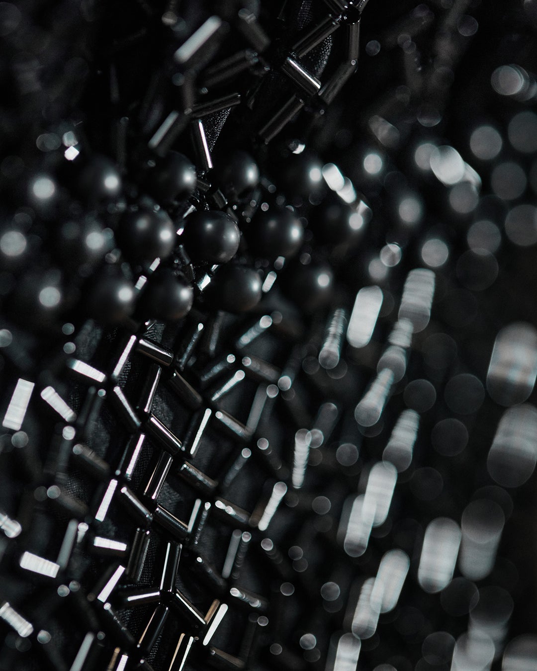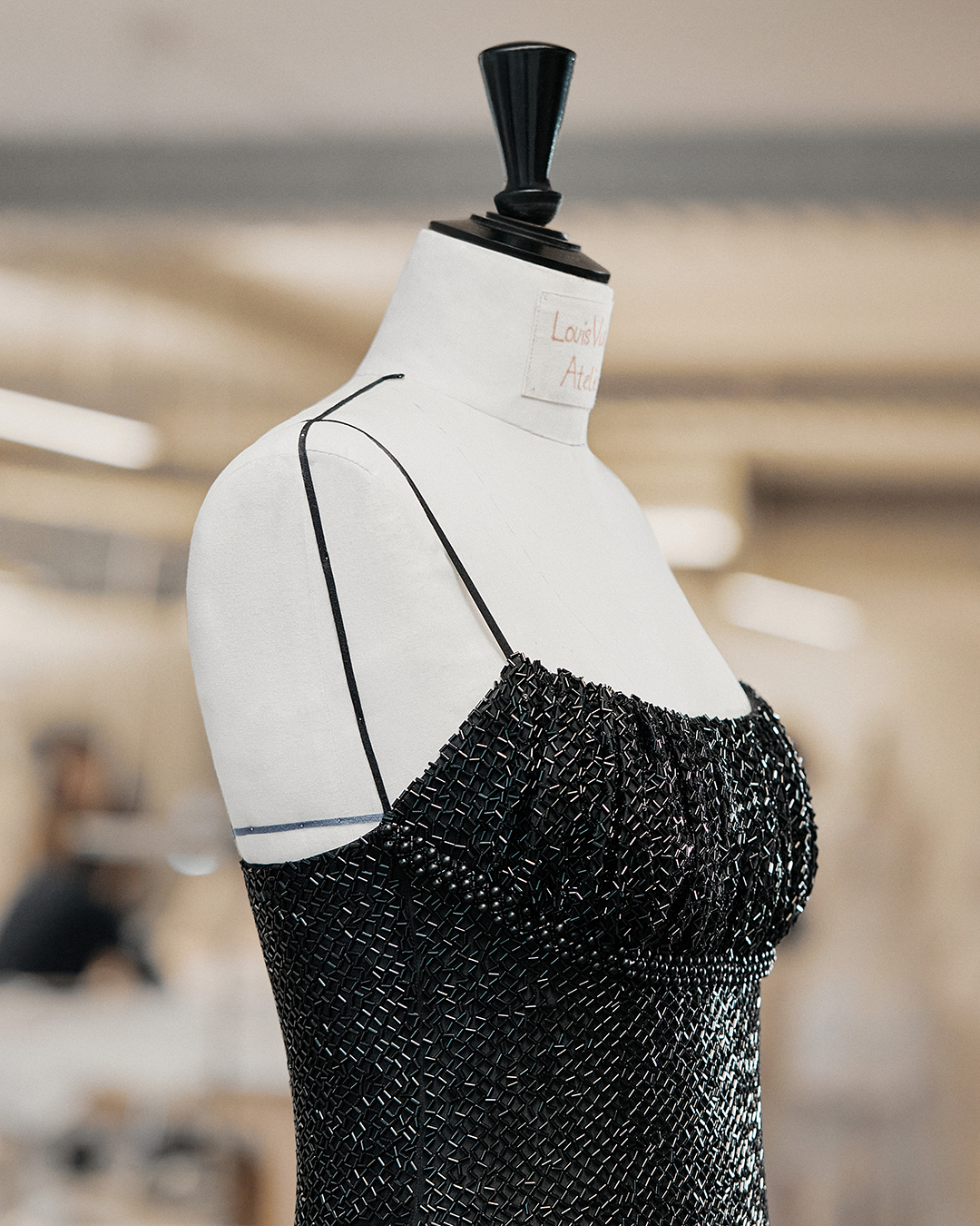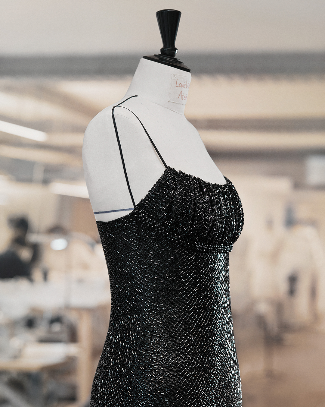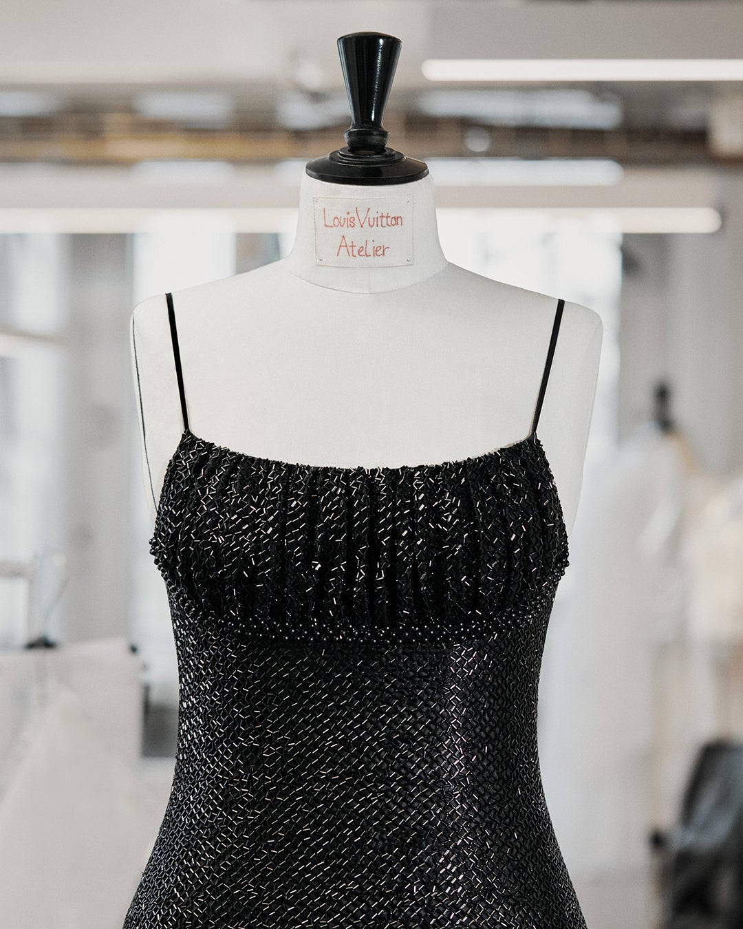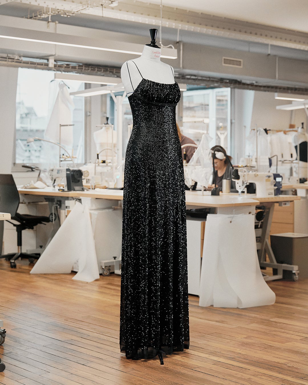 シルクのシャルミーズにブラックのガラスチューブが手刺繍されたこのドレスは、パール約70,000個が施されており、刺繍図の配置に約45時間、制作に約350時間、さらに手刺繍に約1700時間をかけて完成しました。
