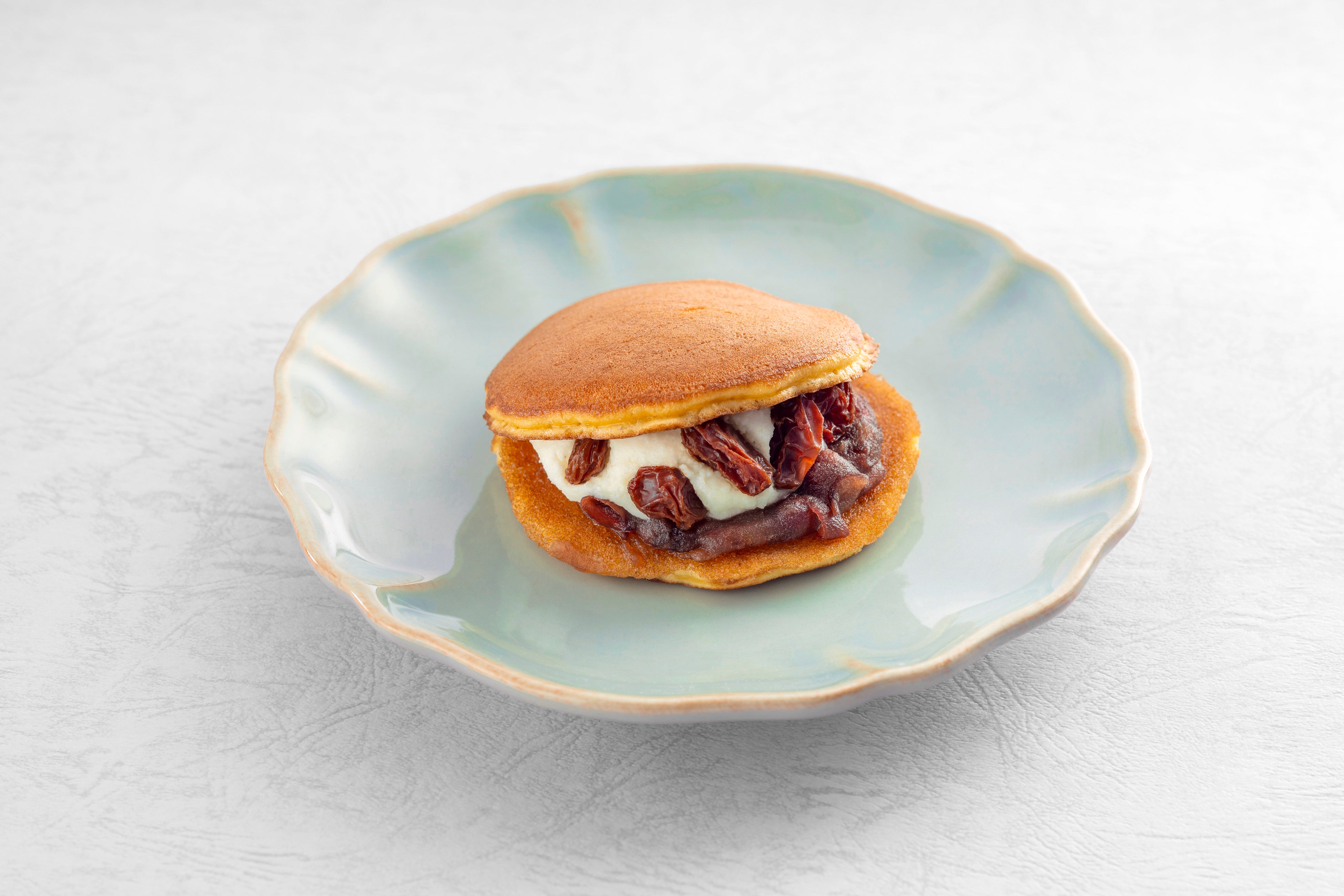 リコッタチーズのコクと、ラム酒漬けレーズンの香りがベストマッチ。しっとりとした生地で包んだ、和洋折衷のどら焼きです。