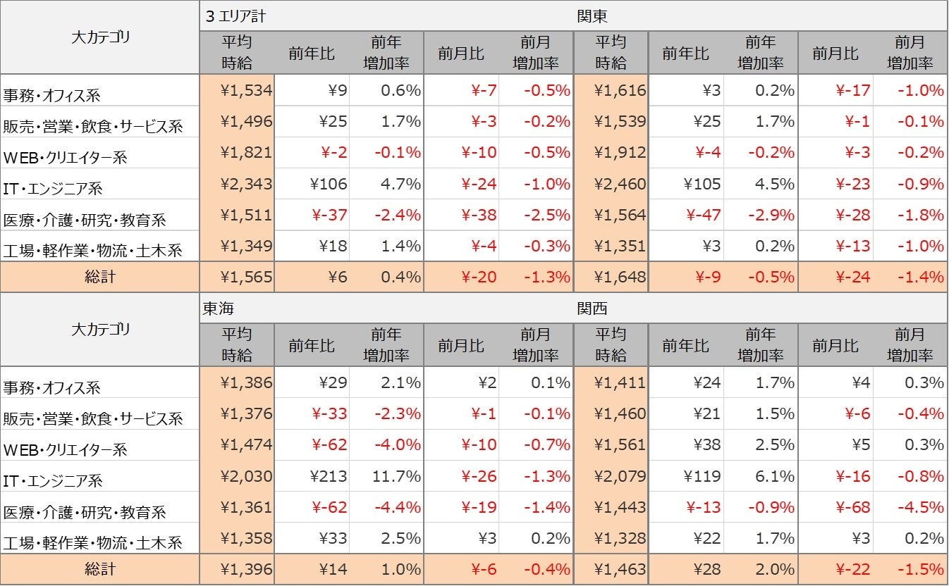 各エリアの平均時給について、関東エリアは1,648円(前年比9円減、前月比24円減)、東海エリアは1,396円(前年比14円増、前月比6円減)、関西エリアは1,463円(前年比28円増、前月比22円減)となりました。