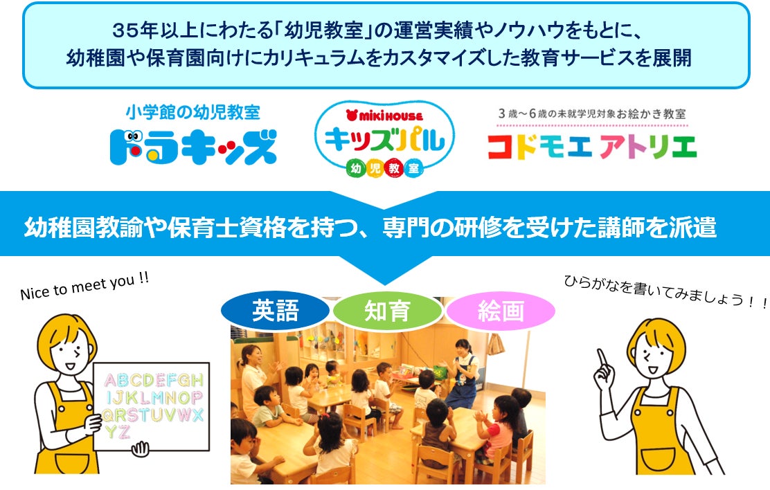 ShoProは幼児教室の全国展開、通信教育、保育園・アフタースクールの運営、保育園・幼稚園・こども園への授業・教育プログラム提供など、幅広い教育事業を展開しています。