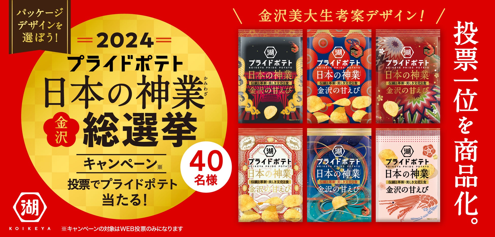 株式会社湖池屋(社長:佐藤章)は、世界から注目を集める“日本産食材の魅力”を支える匠の技と情熱の結晶である“日本の神業”を中核とした「湖池屋プライドポテト 日本の神業」シリーズより、2024年11月に発売予定の「湖池屋プライドポテト 日本の神業 金沢の甘えび」のパッケージデザインを一般投票により決定する『湖池屋プライドポテト 日本の神業 金沢 デザイン総選挙』を実施します。