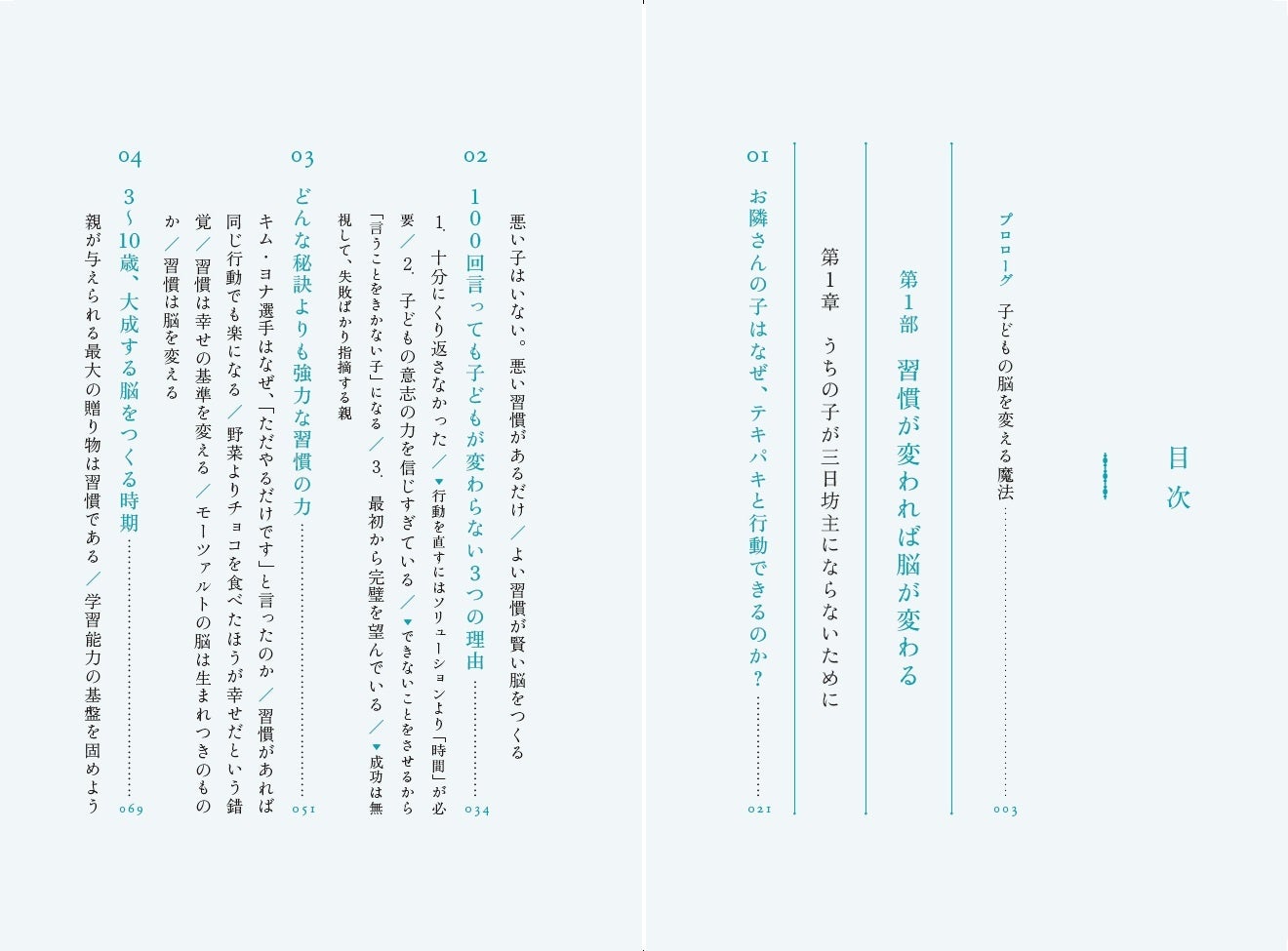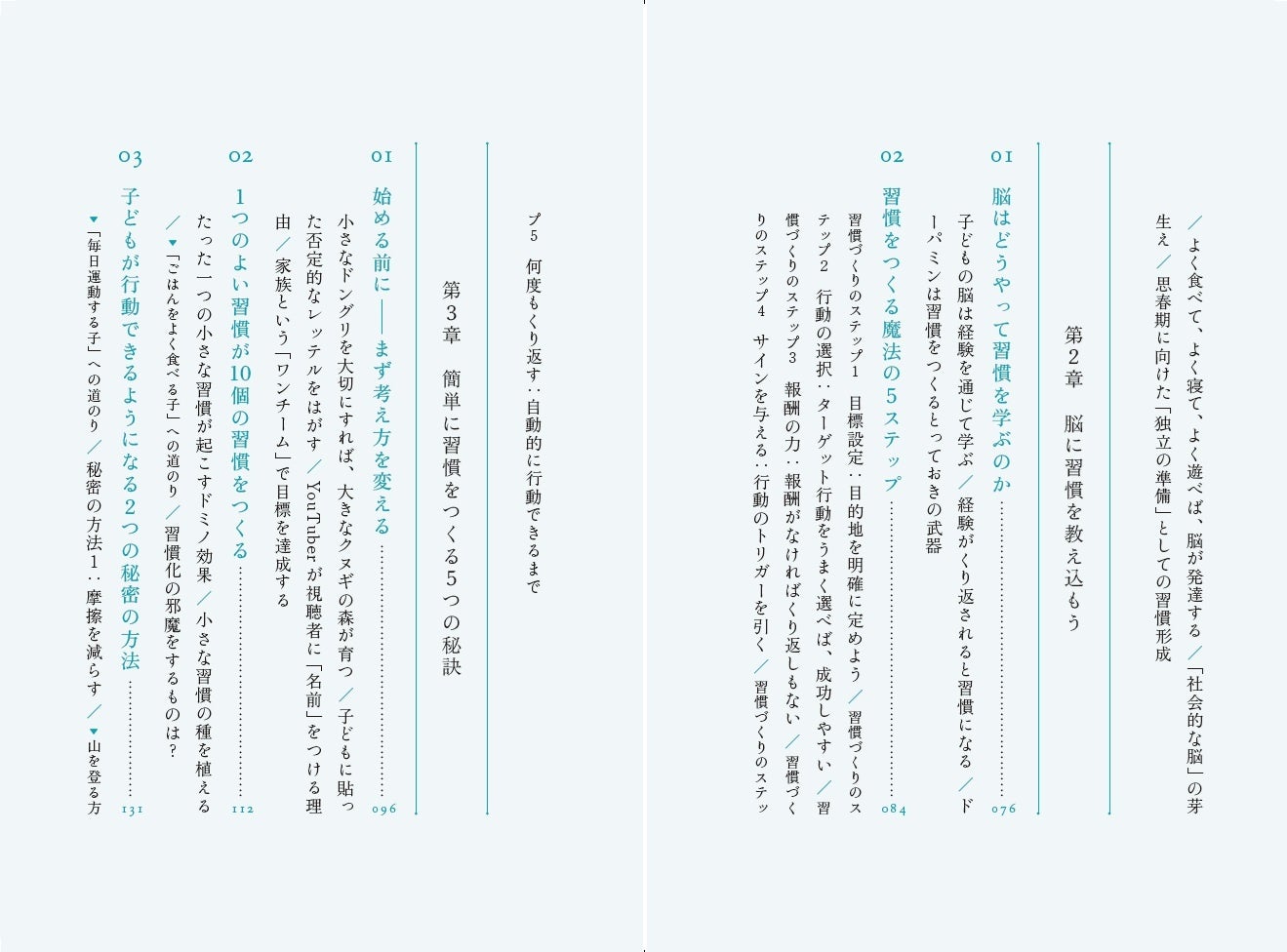 柔らかい子どもの脳を変えるのは日々の小さな行動の“くり返し”=習慣の力。つまり、「よい習慣」は賢い脳をつくる力を持っています。本書が提唱する「脳に習慣を教え込む方法」「行動を自動化するルーティン設計」「自己肯定感を上げる子どもへの声かけ」といったメソッドを使うことで、人生を自分の力で切り開く「自分でできる子」に導くことができるのです。