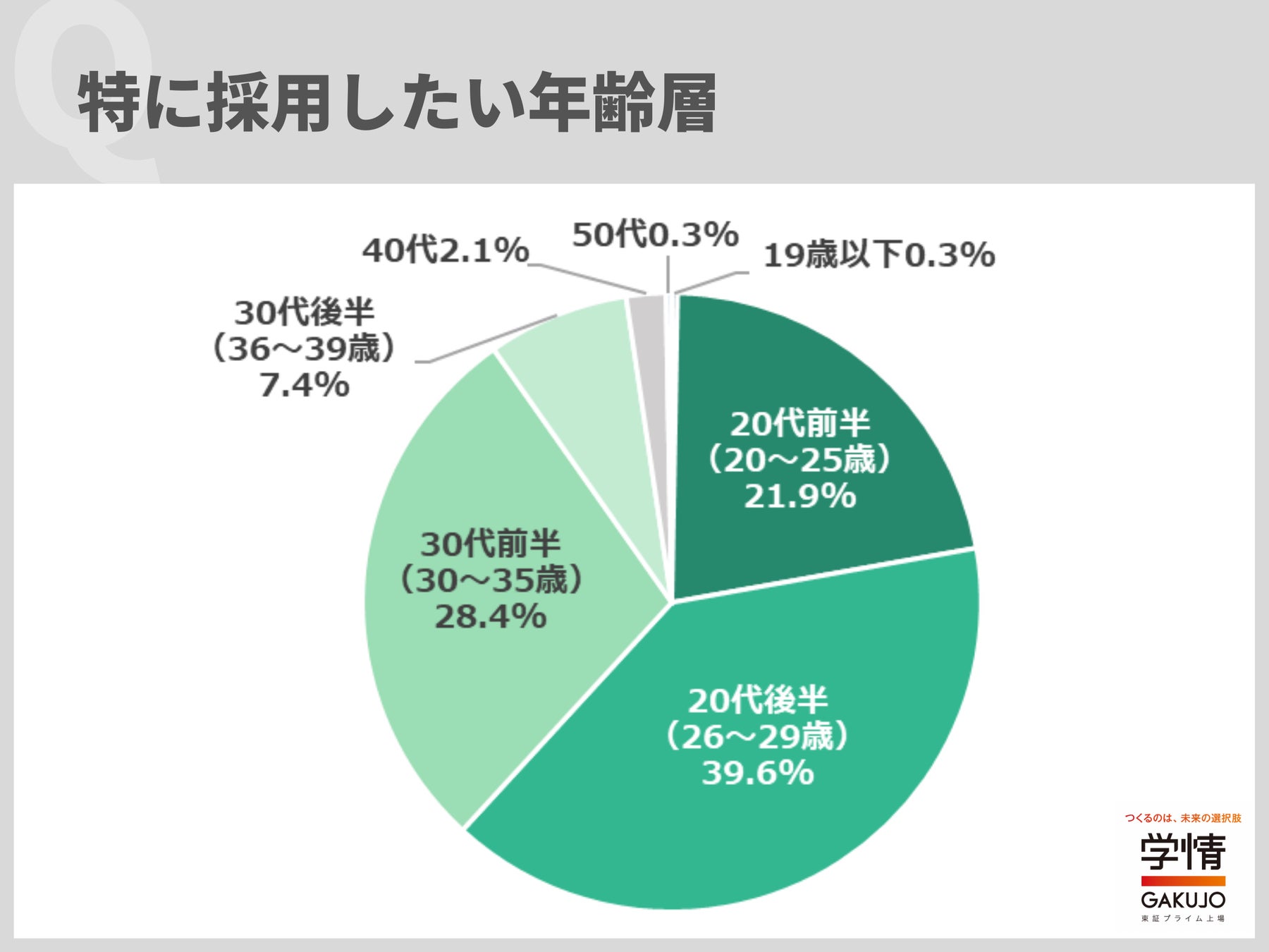 株式会社学情(本社:東京都中央区)は、企業・団体の人事担当者を対象に、「採用対象」に関するインターネットアンケートを実施しました。キャリア採用において、特に採用したい年齢層は「20代後半」が39.6%で最多。次いで「30代前半」が28.4%で続き、「20代後半~30代前半」が約7割を占めました。「20代前半」21.9%よりも、「30代前半」を採用したい企業が多い点は注目に値します。一方、20代対象のキャリア採用で求める経験については、「採用するポジションで活かせる経験を求める」が34.1%でトップ。2位の「同業界・同業種での経験を求める」26.0%を合わせると6割に上り、一定程度の業務経験を重視する企業が多いことも分かりました。経験が浅い「20代前半」よりも、ある程度の業務経験を積んだ若手を求める傾向が強いことが読み取れます。