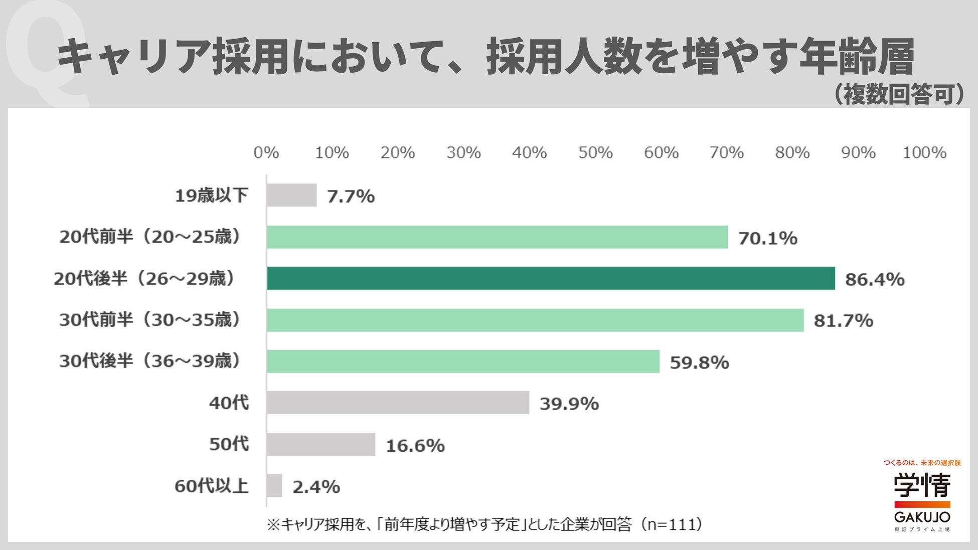 キャリア採用において、対象となる年齢層(複数回答可)は「20代後半」が86.4%で最多。次いで、「30代前半」81.7%、「20代前半」70.1%が続きました。
