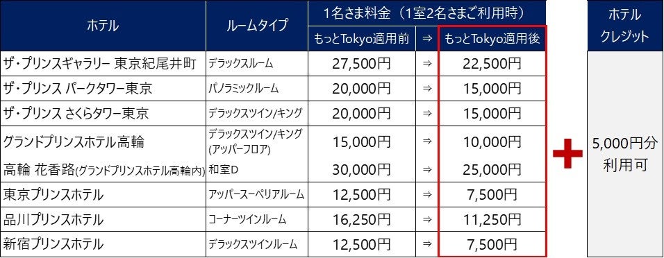 「もっとTokyo」に「ホテルクレジット¥5,000分」を付けたダブルでお得な宿泊プランを品川プリンスホテルなど、都内7ホテルで販売