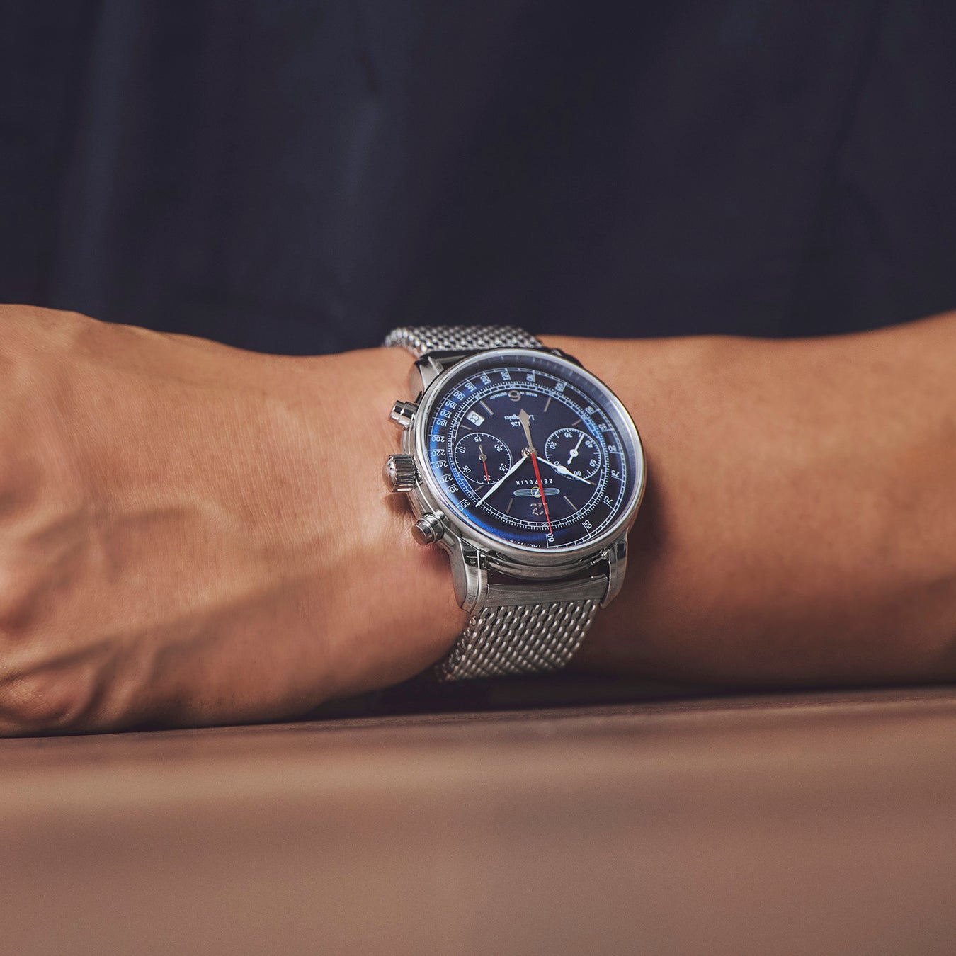 搭載されたムーブメント(駆動装置)「Sellita SW510 BH a」は、スポーティな印象を高める2カウンタークロノグラフ仕様。奥深いダークブルーダイヤルの上でスムースに運針する様は、大西洋上を飛行する“ロサンゼルス号”のように悠然とした表情を見せます。そこに丁寧に磨き込まれた独特のケースや気品にあふれるミラネーゼブレスが組み合わさり、特別な風格をまといます。