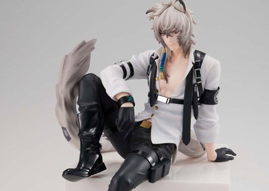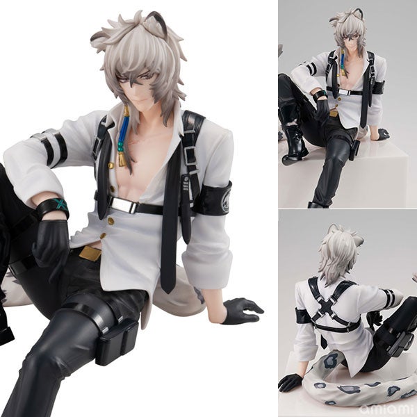 不敵な表情にグラデーションがかった髪が美しいシルバーアッシュは、大胆にはだけた白いシャツから覗く胸元がセクシー!シャツやパンツのシワ、ブーツの光沢まで見事に表現され、アーネスやサスペンダー、手袋にネクタイの小物まで丁寧な造形です。獣耳や躍動感のある立派な尻尾も健在!