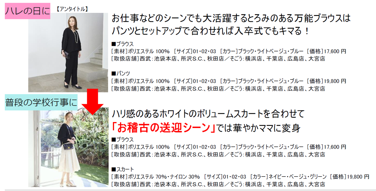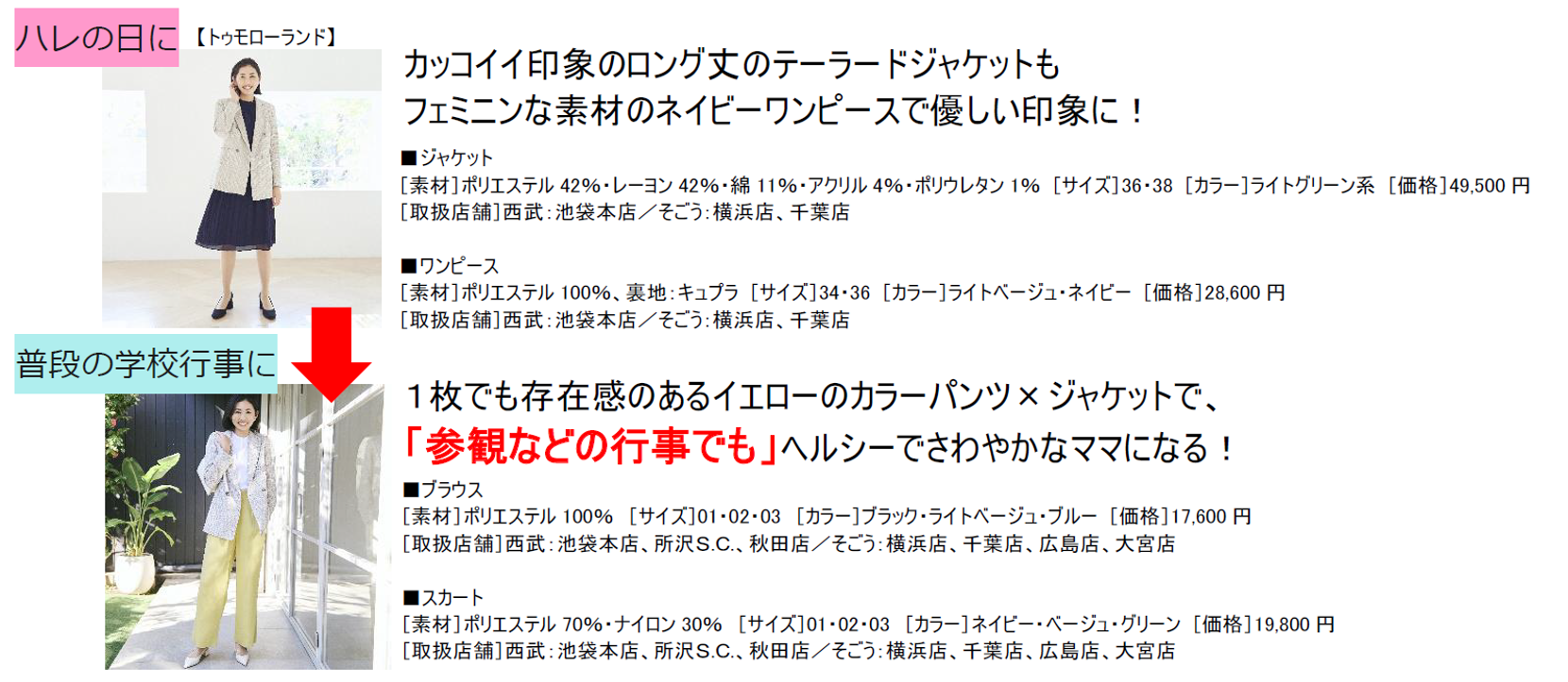 そごう・西武では、卒業・入学式などで着用するお祝い服が好調です。春のお祝い服にもおすすめのアイテム(ジャケット、スカート、パンツ、ブラウス)は前年比130%と伸長しています。昨年まではコロナ禍の行動制限で式典の中止や短縮がありましたが、今年の春は行動制限もなく、こども達のハレ舞台にも日常が戻ってくると予想されることから春のお祝い服のニーズが高まっています。またここ数年のお客さまの動向として気温の変化が読めないことを理由に従来のセットアップやツィードジャケットを着ないスタイルも増えてきたとが分かっておりました。そこで、そごう・西武では「汎用性」キーワードは残しつつも今までのように仕事着との着回しではなく、卒業・入学式後の保護者会や送り迎えなどにも使えるママの学校行事スタイルに着目し提案しています。