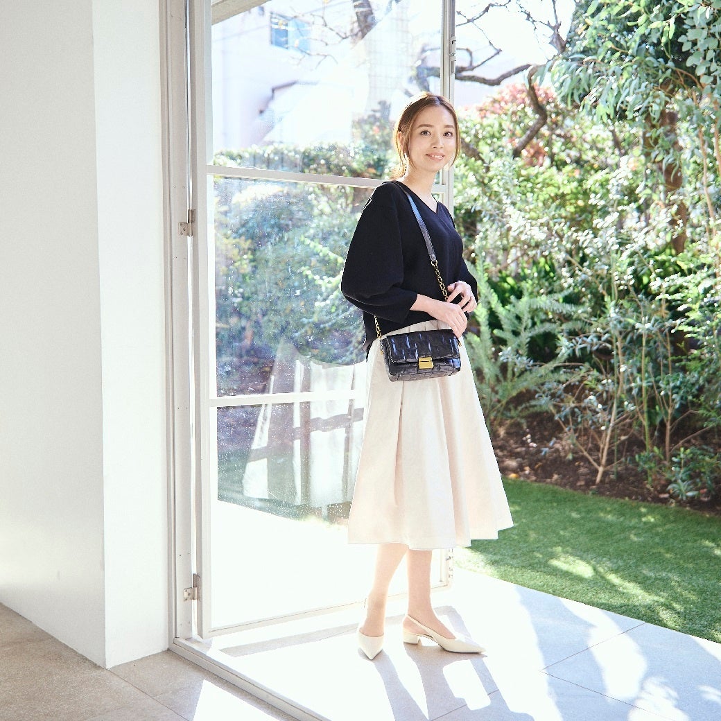 ハリ感のあるホワイトのボリュームスカートを合わせて「お稽古の送迎シーン」では華やかママに変身