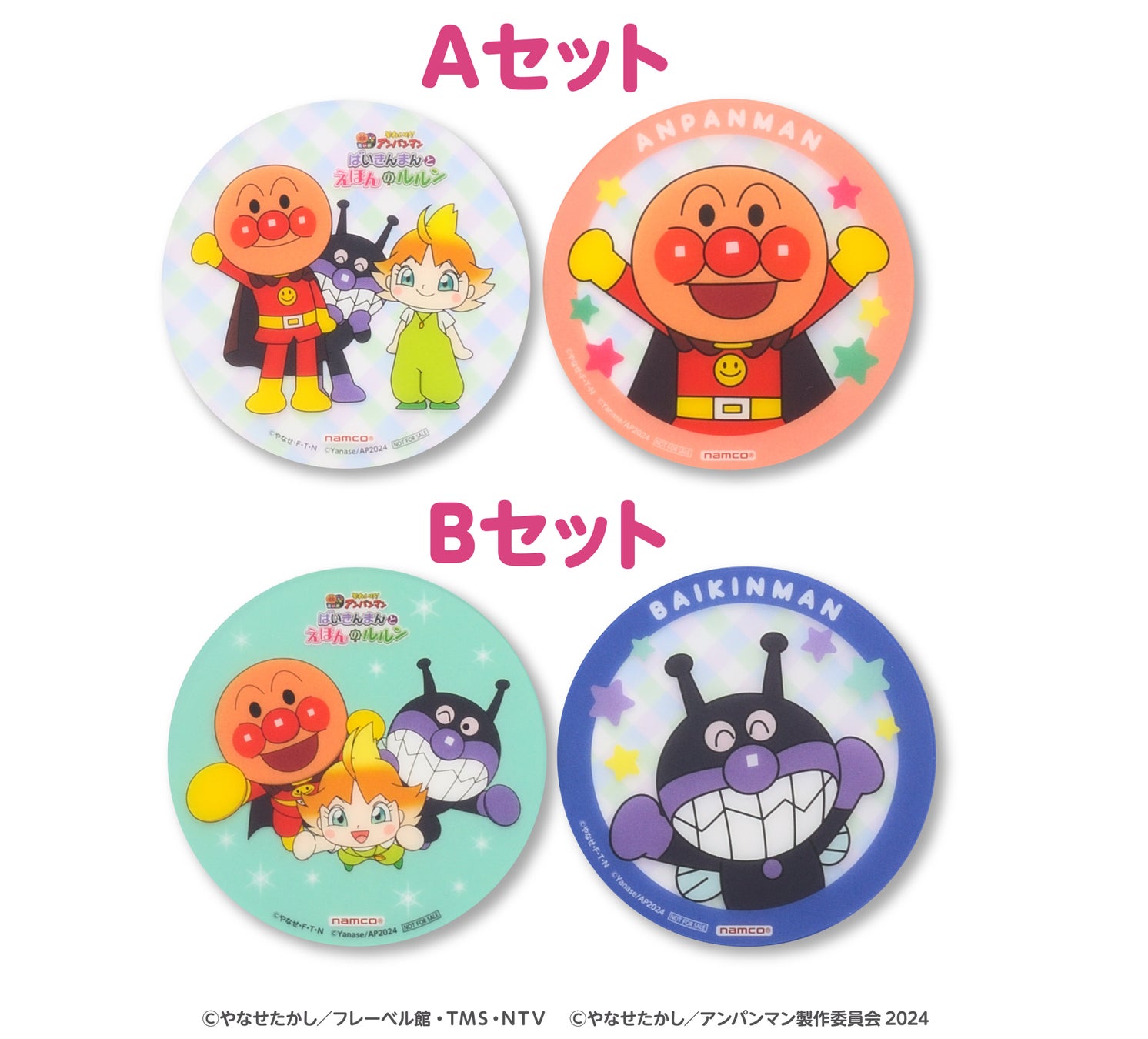 映画『それいけ!アンパンマン ばいきんまんとえほんのルルン』の鑑賞済み映画館チケットを対象店舗のスタッフに提示すると、ナムコオリジナルシールをプレゼントします。アンパンマン・ばいきんまん・ルルンの3人が描かれた2種類のデザインから選べます。