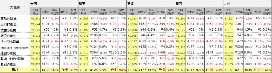 関東エリアの平均時給は1,386円(前年比125円増、前月比8円減)、東海エリアの平均時給は1,326円(前年比127円増、前月比6円減)、関西エリアの平均時給は1,323円(前年比114円増、前月比19円減)、九州エリアの平均時給は1,355円(前年比211円増、前月比23円減)となりました。