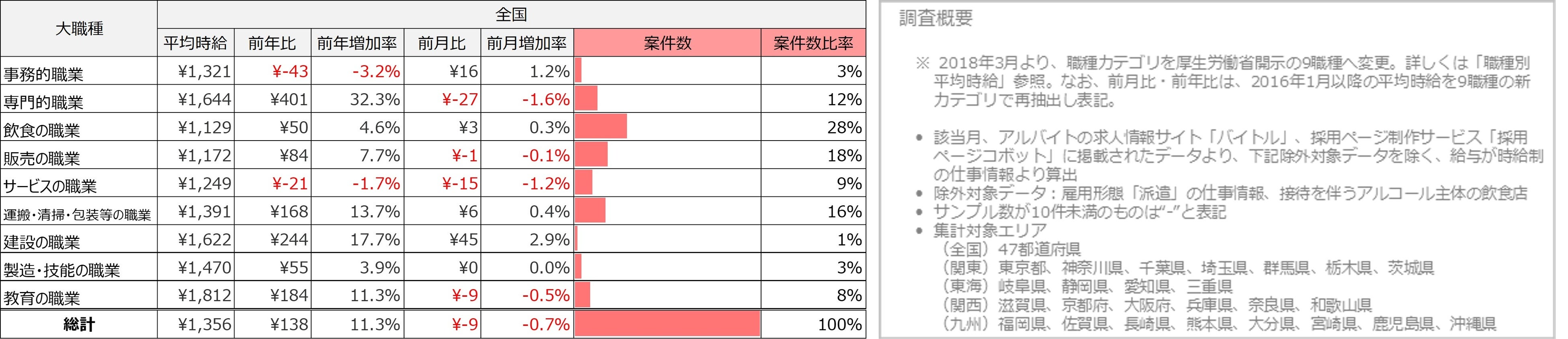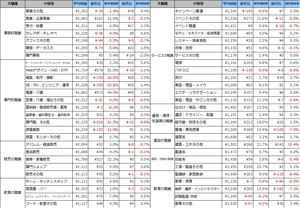 職種別の平均時給は、9職種中7職種の大カテゴリが前年を上回りました。事務的職業は1,321円(前年比43円減、前月比16円増)、専門的職業は1,644円(前年比401円増、前月比27円減)、飲食の職業は1,129円(前年比50円増、前月比3円増)、販売の職業は1,172円(前年84円増、前月比1円減)、サービスの職業は1,249円(前年比21円減、前月比15円減)、運搬・清掃・包装等の職業は1,391円(前年比168円増、前月比6円増)、建設の職業は1,622円(前年比244円増、前月比45円増)、製造・技能の職業は1,470円(前年比55 円増、前月比±0円)、教育の職業は1,812円(前年比184円増、前月比9円減)となりました。