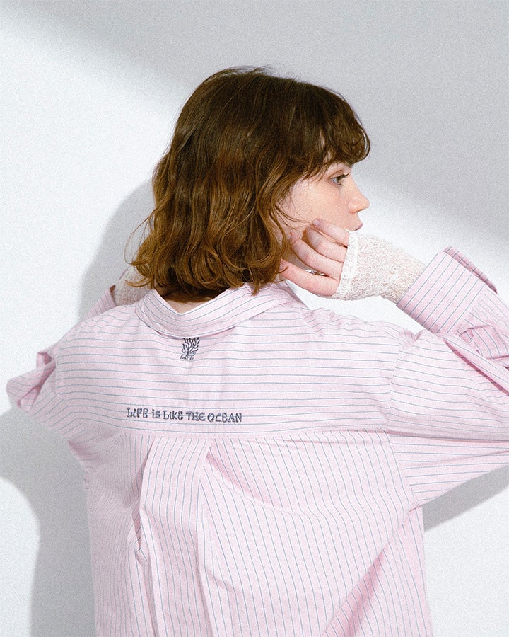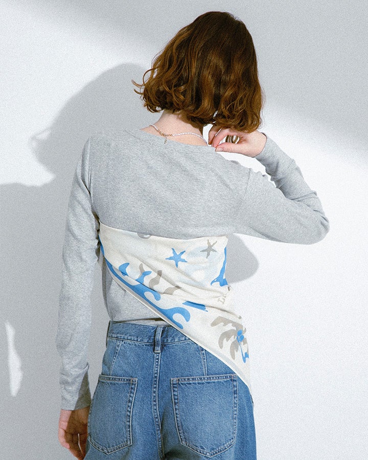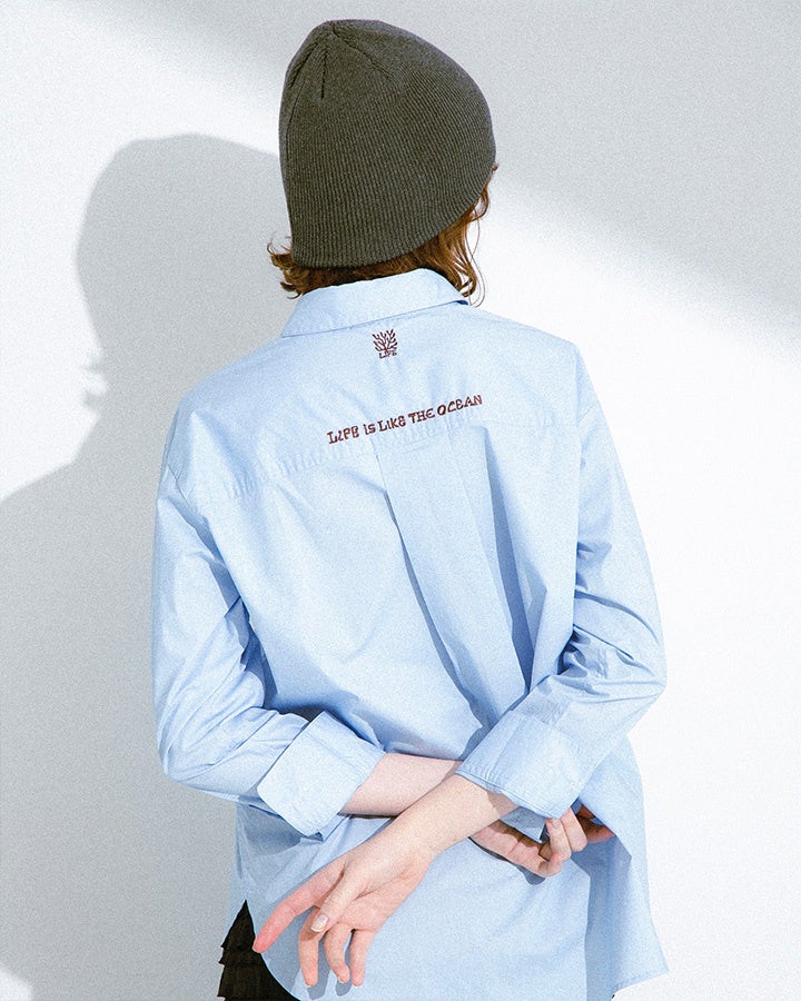 バックプリントにアート感のあるグラフィック、胸元や袖口にはオリジナルロゴ刺繍をあしらいさりげないアクセントを効かせました。