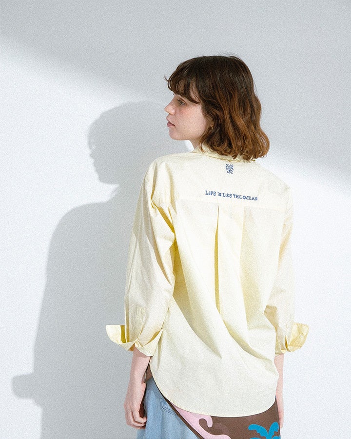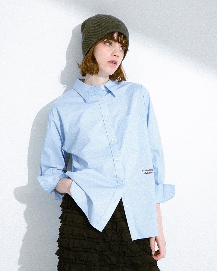 刺繍で施したプレイフルなイラストとロゴがスタイリングのアクセントになるエンブロイダリーシャツ。