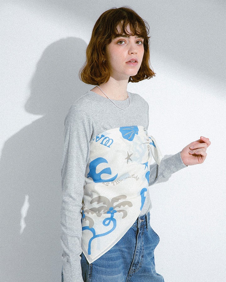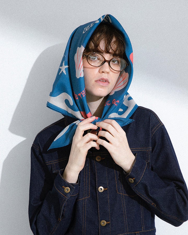 海やビーチの風景をモチーフに描かれたポップで遊び心のあるイラストが目を惹くスカーフ。
