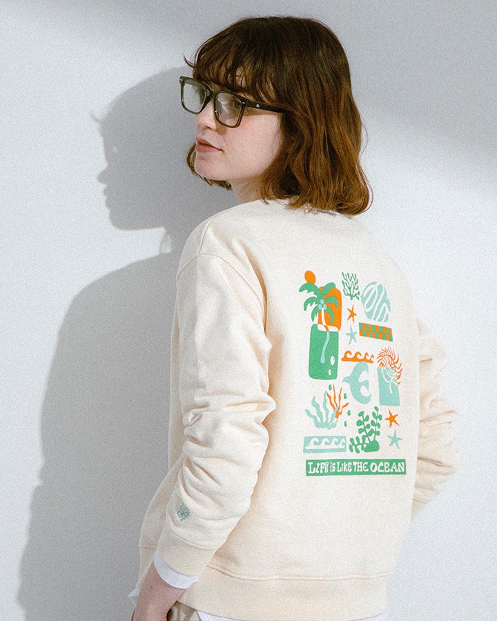 海やビーチの風景をモチーフにしたイラストが印象的なスウェットプルオーバー。