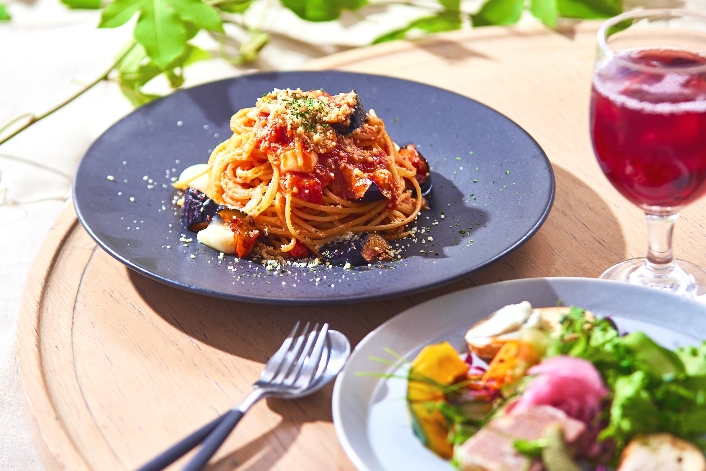 茄子とモッツアレラチーズのトマトパスタ 1,200円/WEEKEND 1,500円(サラダ・バケット付き)