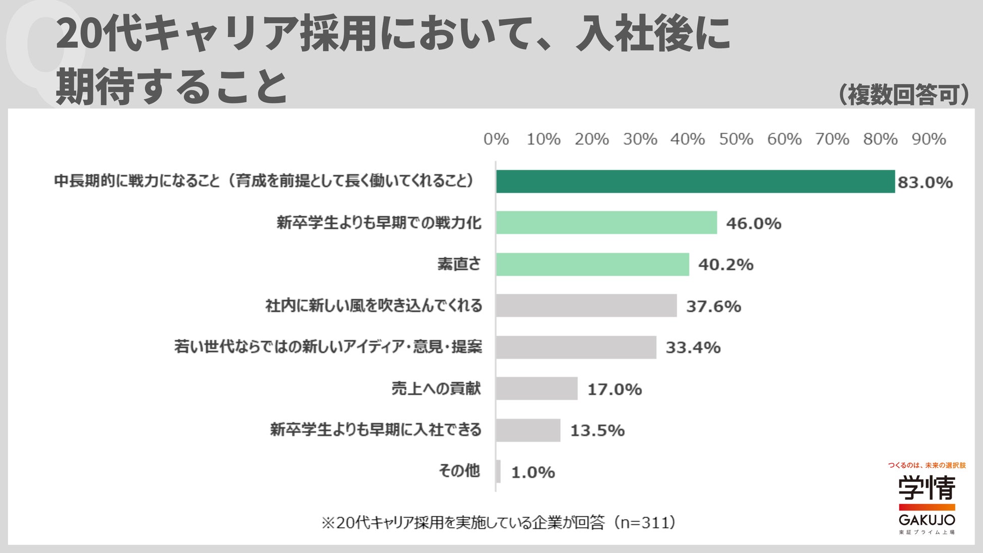 株式会社学情(本社:東京都中央区)は、企業・団体の人事担当者を対象に、「20代を対象としたキャリア採用」についてインターネットアンケートを実施しました。20代キャリア採用を実施している理由は、「キャリア採用(経験者採用・第二新卒採用)強化のため」が最多で、「新卒採用だけでは、若手採用を充足できないから」が僅差で続きました。入社後に期待することは、「中長期的に戦力になること(育成を前提として長く働いてくれること)」を選んだ企業が8割を超え、突出する結果となりました。いずれも、新卒一括採用での人材獲得競争の激化を受け、新卒と若手キャリアを一体の「20代若手採用」と捉えて実施する企業が増えている傾向を示しています。