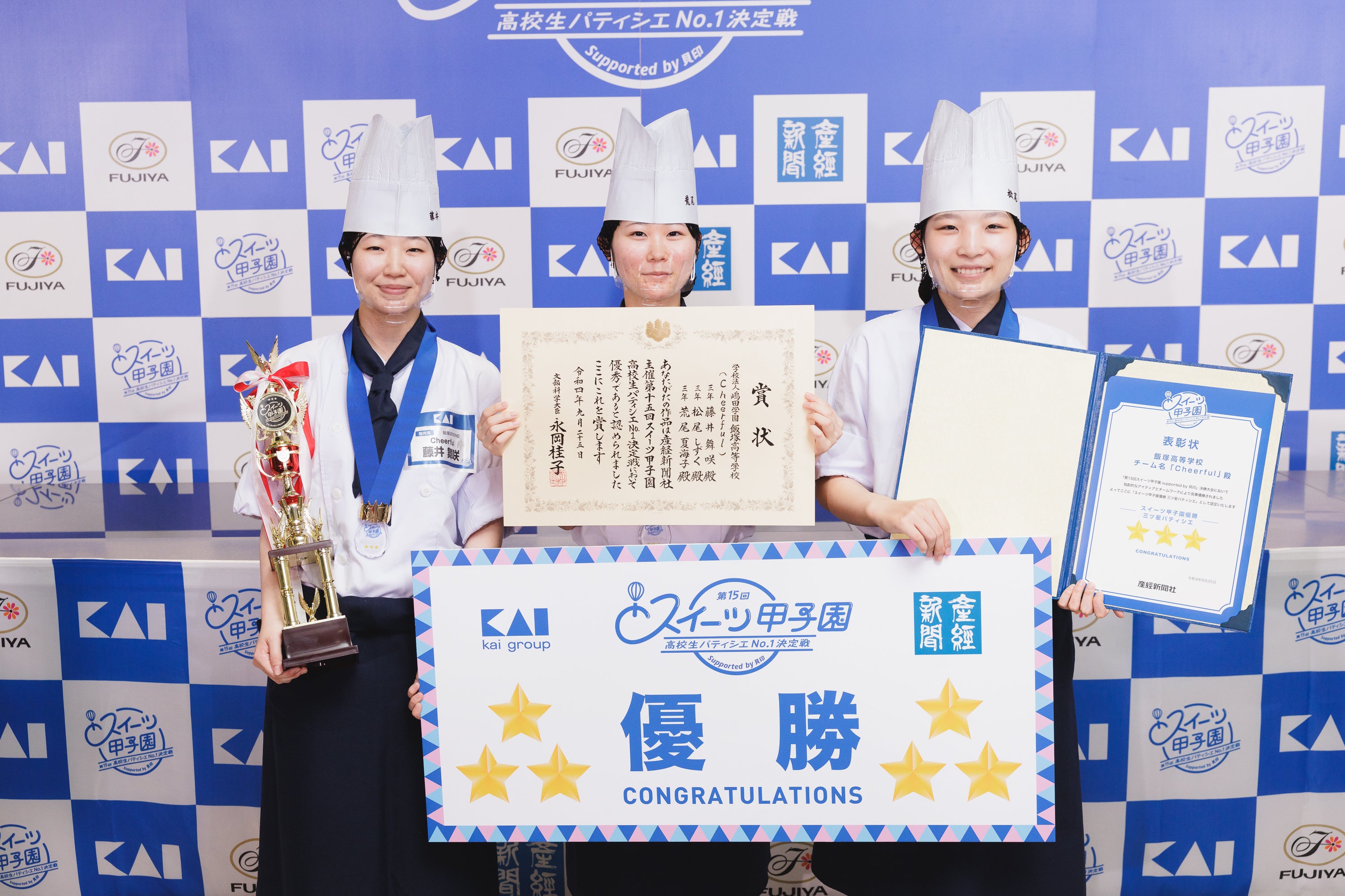 「第15回スイーツ甲子園」優勝チームの飯塚高等学校「Cheerful(チアフル)」のメンバー3人=写真左=と作品「Noel blanc(ノエル ブラン)」