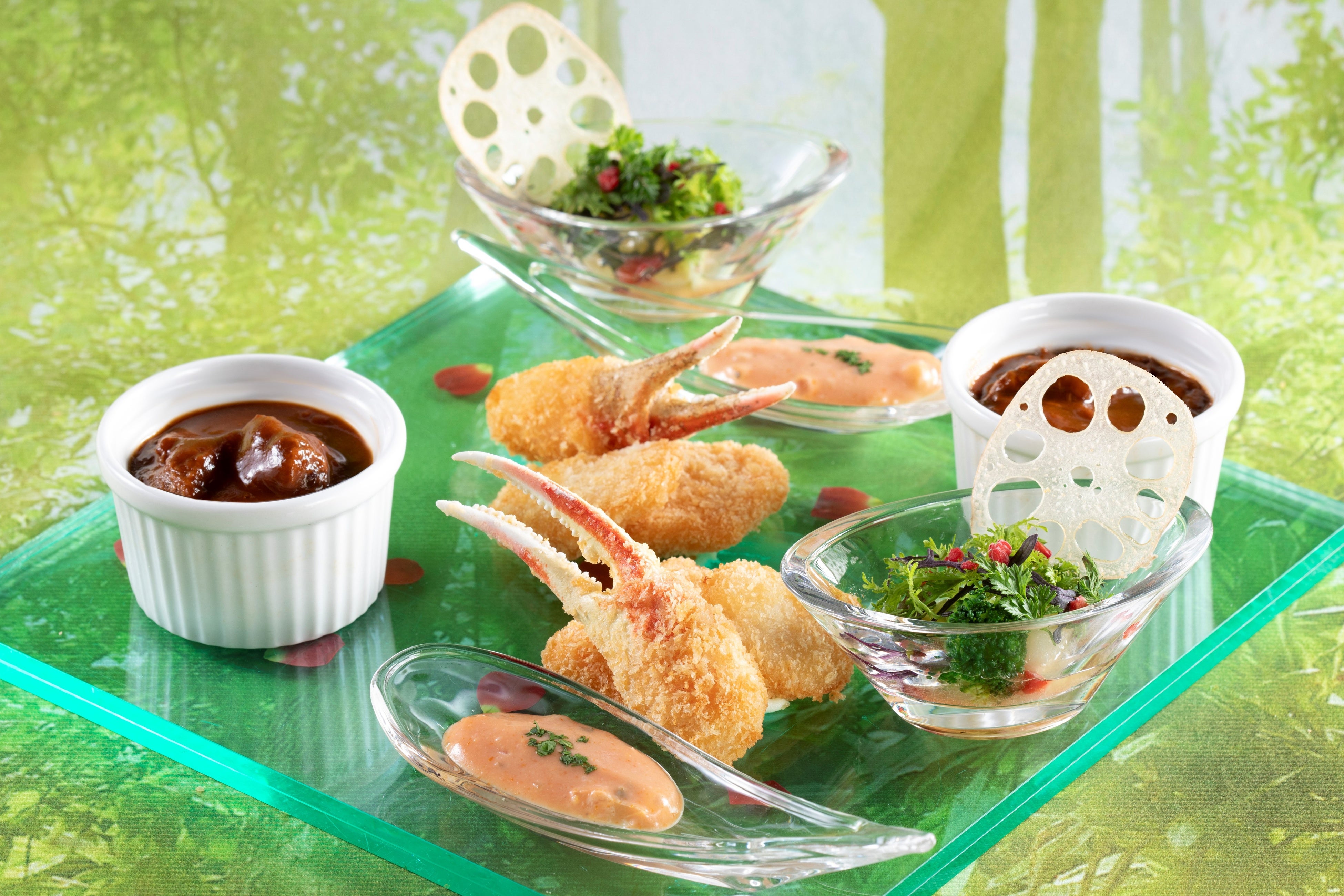 茨モチーフのチョコレートをあしらったいちごプリンや紡ぎ車に見立てたレンコンを添えた木苺のサラダなど、民話「眠れる森の美女」の世界観を表現した華やかなアフタヌーンティー。