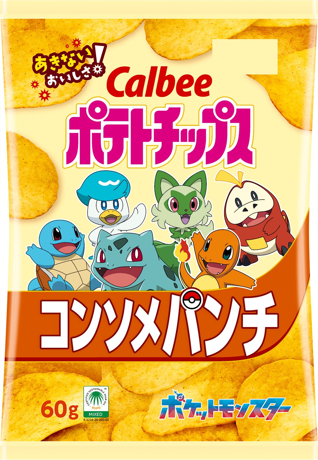 また、定番の「ポテトチップス コンソメパンチ/コンソメWパンチ/うすしお味」も期間限定で「ポケモン」のデザインで発売。「コンソメパンチ」シリーズでは味の濃さに合わせて掲載されている「ポケモン」が“進化”し、店頭を楽しく盛り上げます