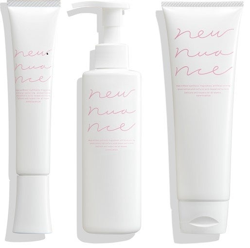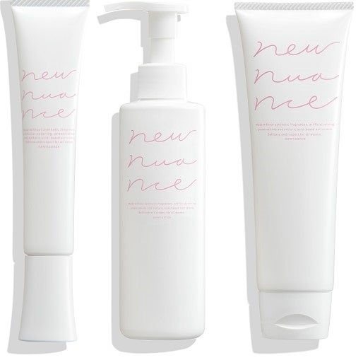 ニューニュアンスの製品はすべて防腐剤、合成香料、合成着色料、硫酸系界面活性剤無添加。天然成分にこだわり、すべて日本国内で製造。