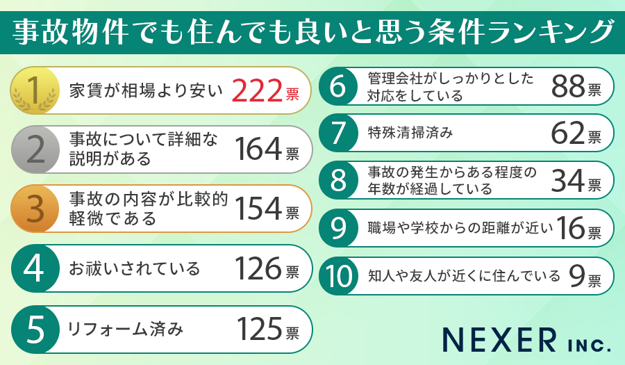 株式会社NEXER・事故物件でも住んでも良いと思う条件に関するアンケート調査