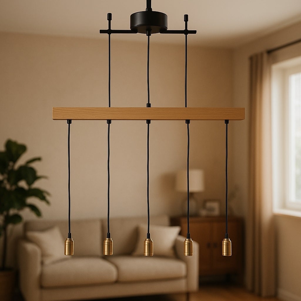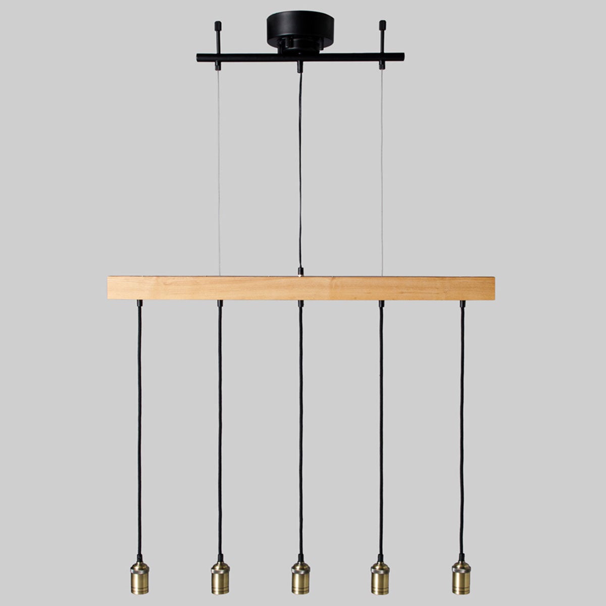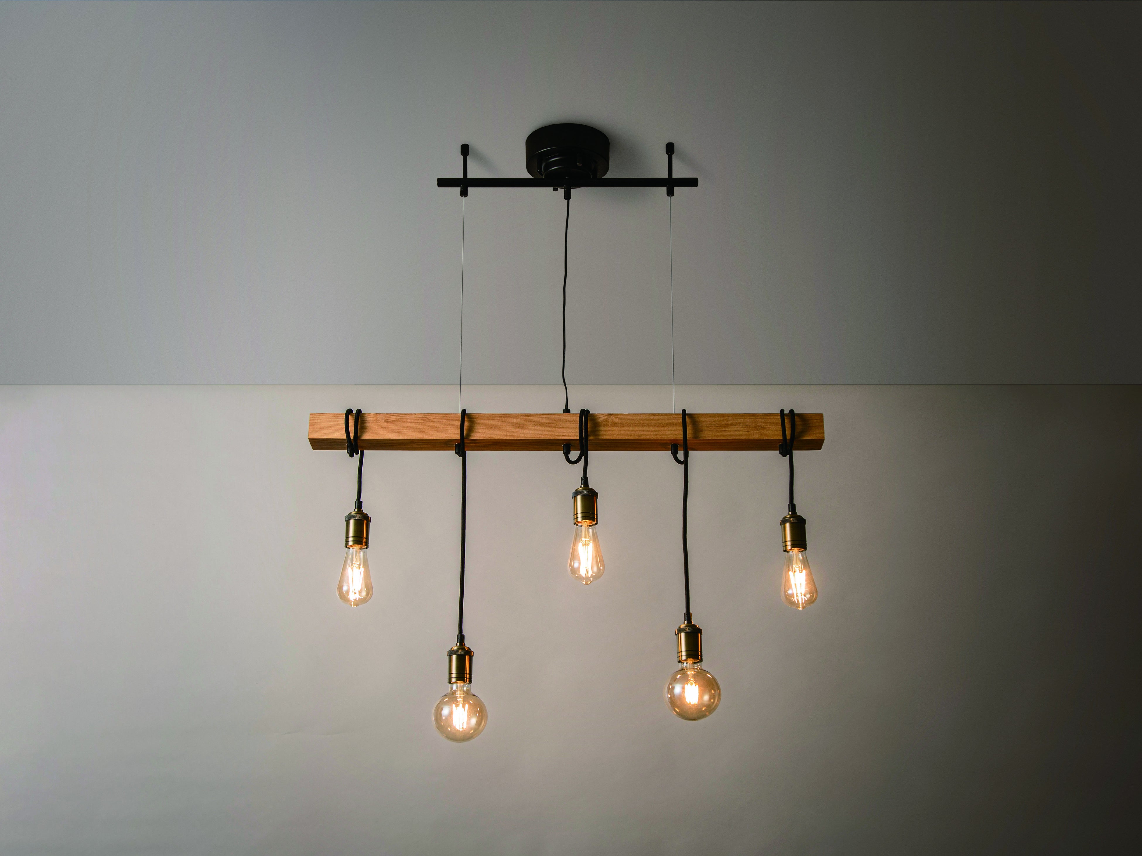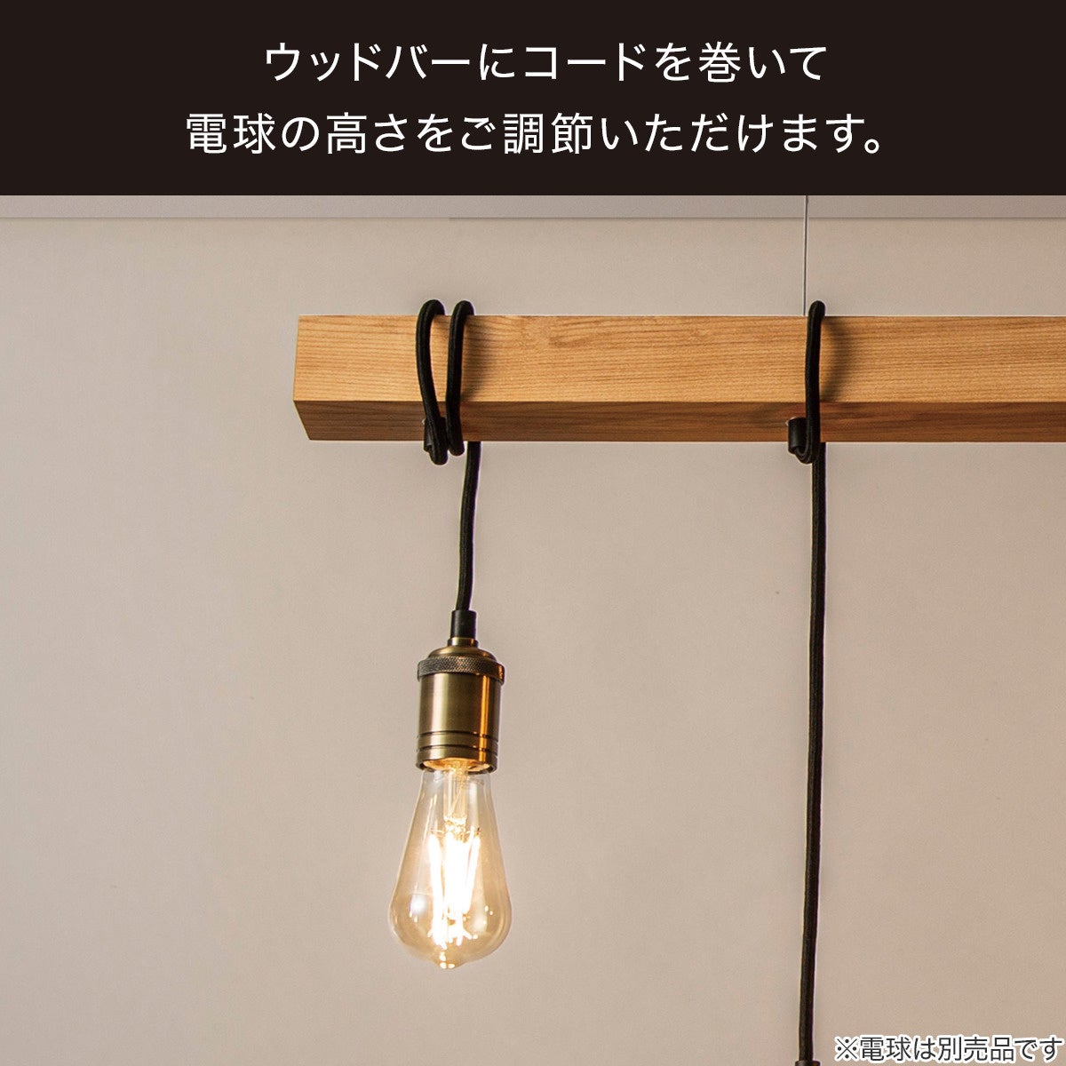 ウッドバーに5つの電球ソケットを吊り下げた個性的なデザイン。ウッドバーの質感と電球のあたたかなあかりが、ぬくもりのある空間を演出します。ウッドバーにコードを巻いて電球の高さを調整することで、電球の高さに変化を出して楽しむことができます。遊び心あふれるペンダントライトです。