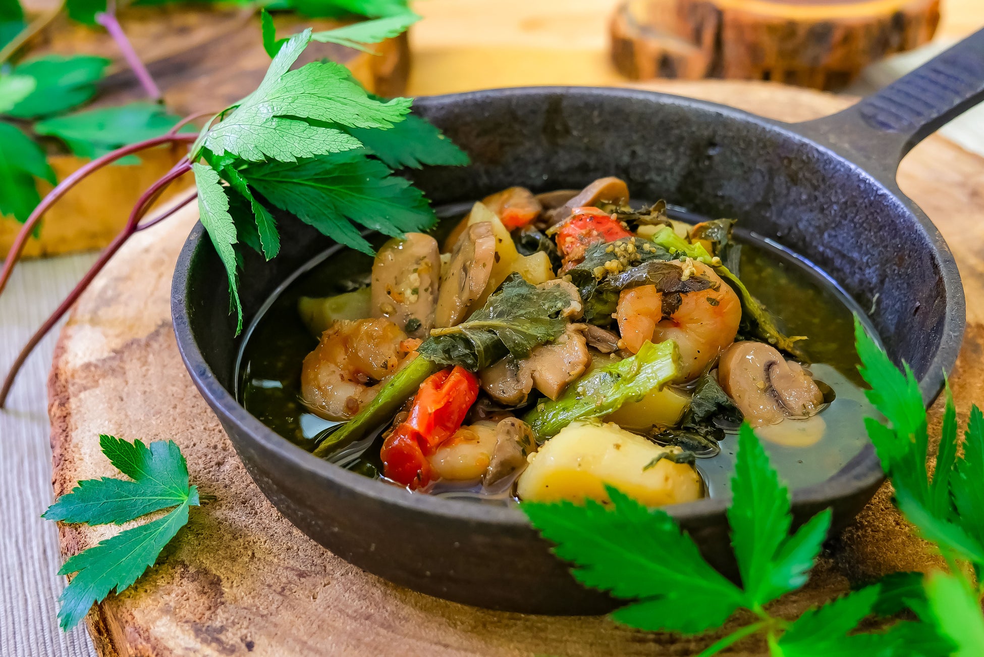 三つ葉やセロリを凝縮したような味わいの大和当帰葉を米油とオリーブオイルでアヒージョに仕上げました。