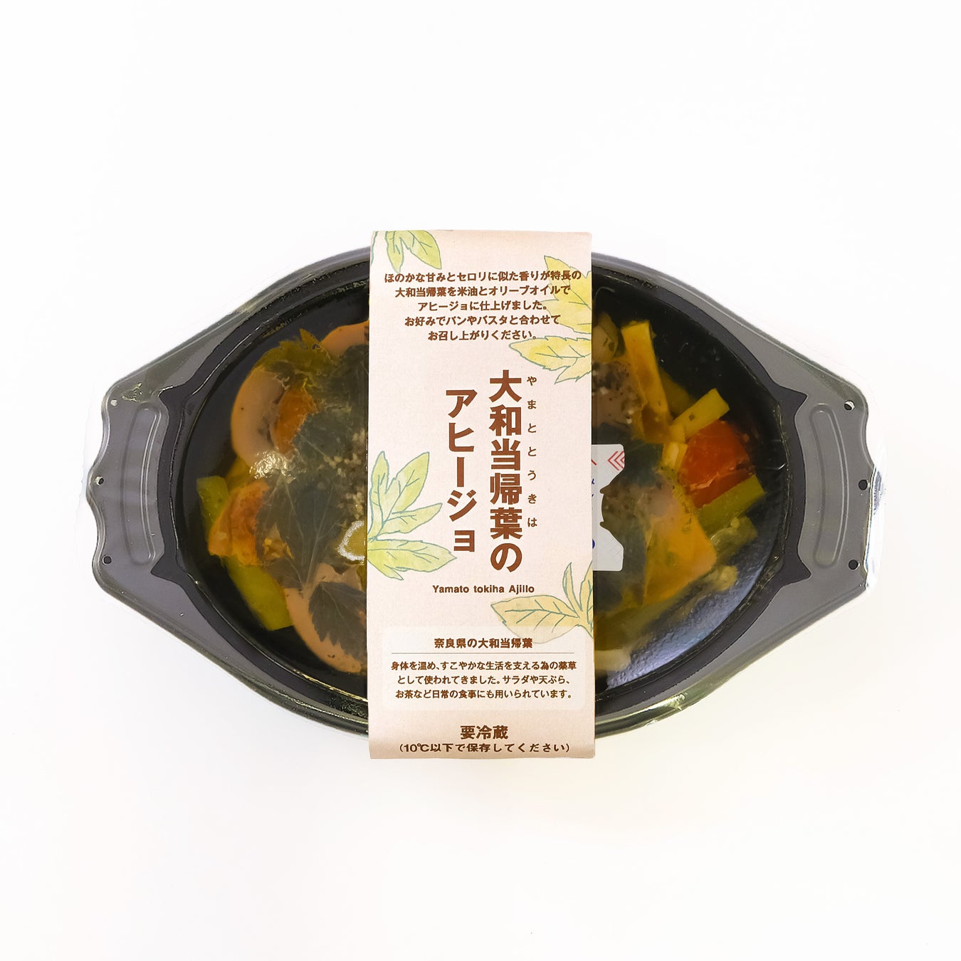 今回近畿事業部では、奈良県高取町で農福連携事業に取り組む「農業生産法人有限会社ポニーの里ファーム」が栽培する大和当帰葉を使った商品を、「株式会社京都義の」「幸南食糧株式会社」と共同開発しました。奈良県の高取町は「日本書紀」にも薬の原料を採取する薬狩りをした場所として記録されるなど、薬の町として知られています。かつては生薬として大和当帰の根は利用されていたものの、葉は使われず廃棄されていました。平成24年に葉が非医(医薬品ではない)扱いとなり、医薬的な効能・効果をうたわなければ食品として販売可能になったことを受け、葉の活用が広がっています。大和当帰の認知度を高めること、葉を有効活用することを目指して商品化を行いました。アヒージョにすることで、味や風味を油に移し、大和当帰葉を食べたときに口の中に広がる三つ葉やセロリに似たアクセントのある強い香りを楽しんでいただけるようにしています。