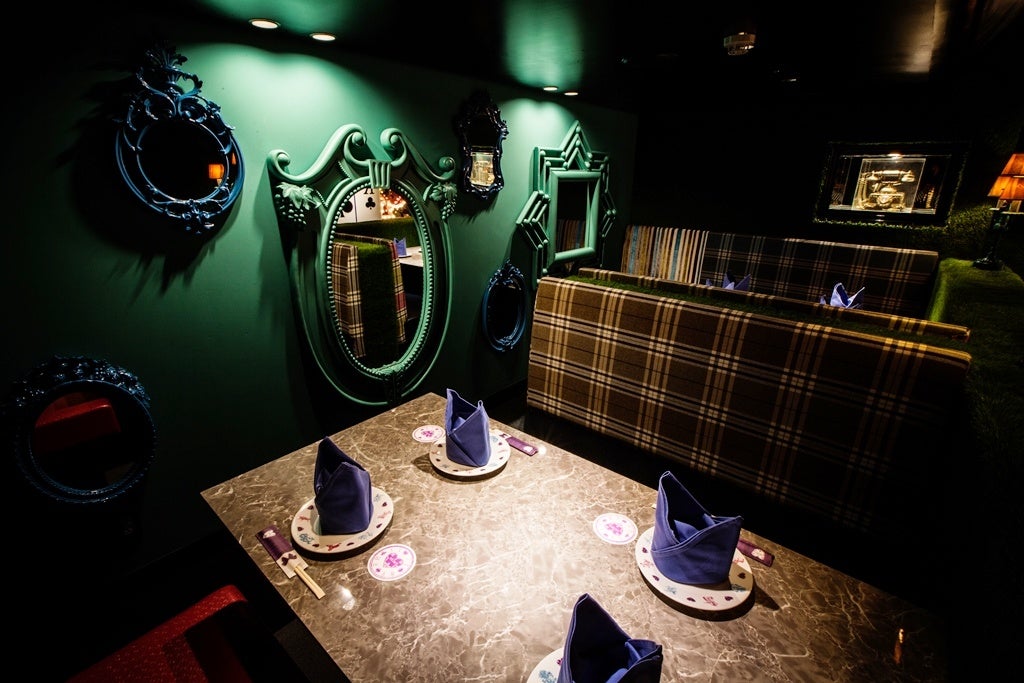 このメインフロアを中心に、大きな大きなトランプに囲まれるソファー席やハートの女王様ご自慢の庭を模したテーブル席など、不思議の国のアリスのパラレルワールドを彷彿とさせる幻想的な空間が広がります。