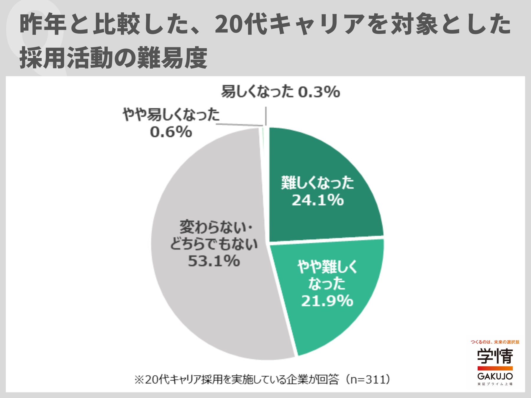 株式会社学情(本社:東京都中央区)は、企業・団体の人事担当者を対象に、「20代を対象としたキャリア採用」の難易度についてインターネットアンケートを実施しました。20代キャリア採用について、8割近い企業が難易度が高いと答えました。「易しい」「やや易しい」との回答は計1.3%だけで、企業の苦戦ぶりが浮き彫りになりました。「給与アップを望む人が多い」「条件面の希望が高くなっている」「給与や休日面でなかなか他社に対抗できない」といった声が上がりました。また半分近い企業が昨年より難易度が上がったと回答。「他社とのスピード競争がより激しくなっている」「中小企業で争奪戦になっている」「好条件の企業が増えてきた」など、企業間の競争激化を指摘する声が寄せられました。加えて「募集企業が数多あるので、選択を迷い、自己分析が曖昧で決められない応募者が増えている」「なぜ転職して何をしたいのかといった思いを持たずに安易に転職活動をしている印象」「志望動機が不明な人が多い」などと求職者の質の変化に言及する声も目立ちました。