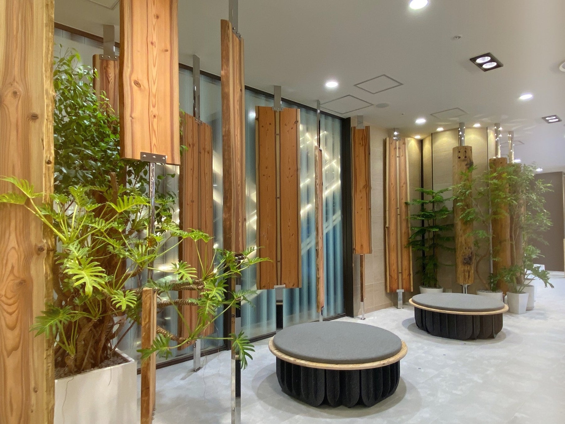 お買い物の合間に荷物の整理や休憩にご利用いただけるレストスペースには、阪急うめだ本店の建て替え工事中に土中から出てきた木材を一部使用。保管していた倉庫の移転に伴い廃棄されるはずだったものに新たな役割を持たせました。一部の椅子には、阪急阪神百貨店全店から回収した、廃棄予定だった衣料をアップサイクルした資材を使用しています。