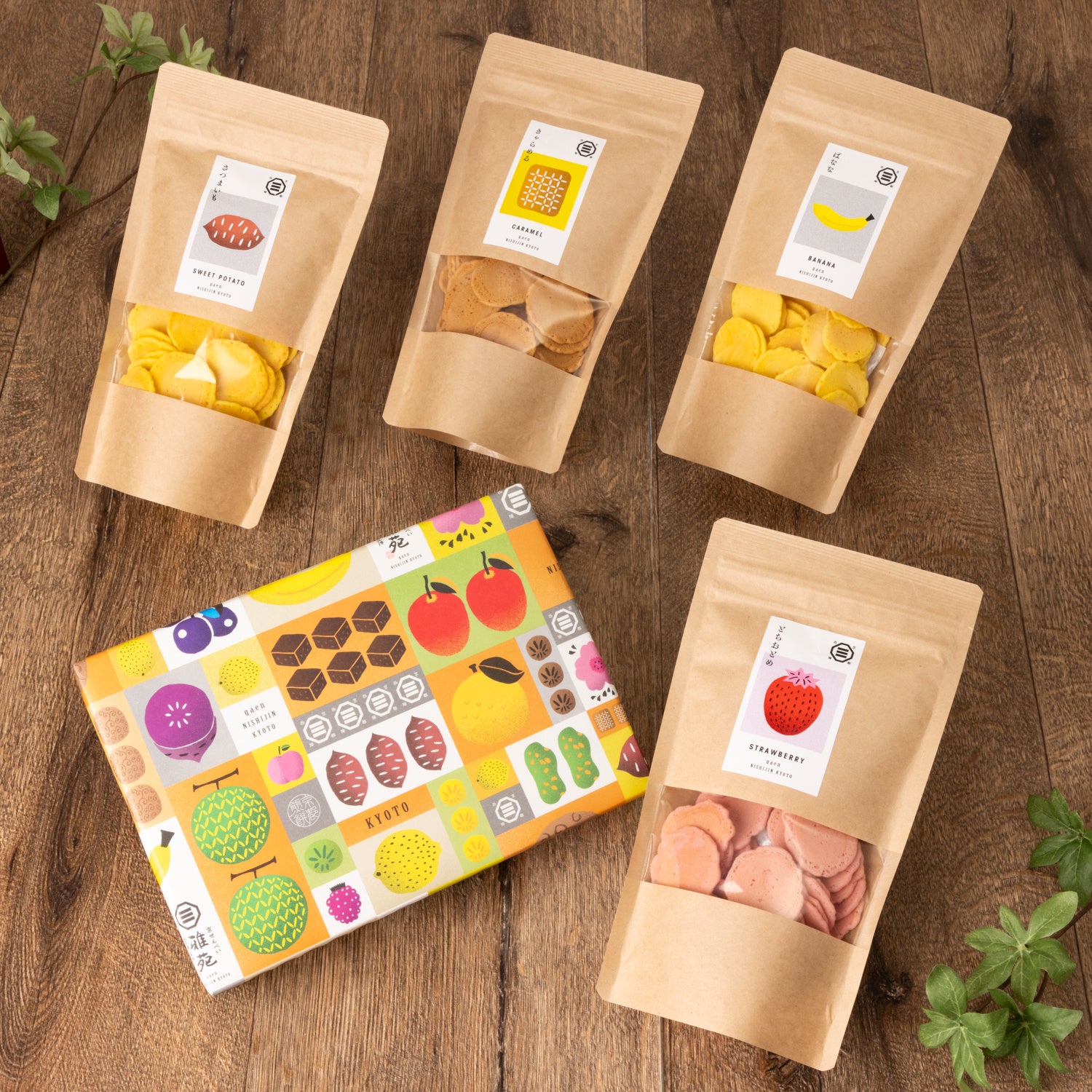 京都の路地奥にある昭和22年創業の雅苑は、伝統の味と技を三代に渡って受け継いでいる京せんべい専門店。フルーツやおいもなどカラフルな色合いが楽しいおせんべい。