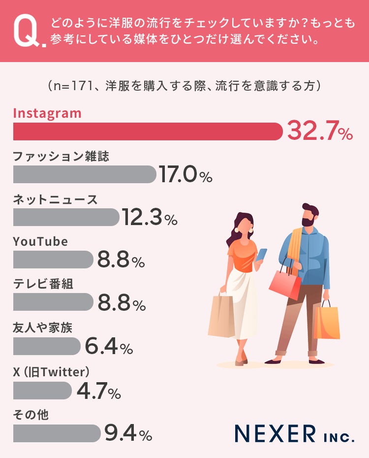 34.2%の方が洋服を買う際に「流行を意識する」と回答しており、流行をどこでチェックするかについては「Instagram」が最多でした。