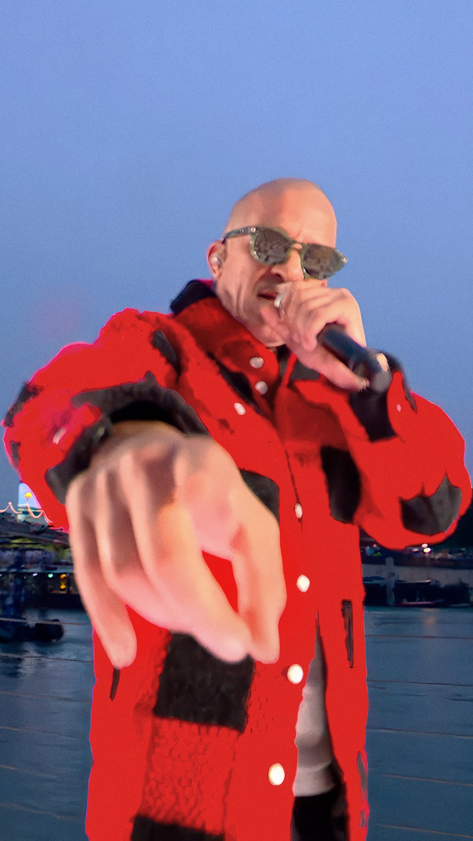その後間もなく行われた開会式では、2人の才能豊かなアーティストがルイ・ヴィトンをまとい登場。アイコニックなアルジェリア系フランス人のラッパーでプロデューサーのRim’K が、フランスの歴史やスポーツ、ダンスをダイナミックかつ華麗に組み合わせた場面で歌を披露しました。Rim’Kが身に着けていたのは、2024秋冬コレクションのパール風のボタン付きブラック & レッドのチェック柄のシアリングジャケットとホワイトのTシャツ、ブラックのフレアジャージーパンツ、そしてブラックのモノグラム・デニムとホワイトのレザー製「LV トレーナー・ライン スニーカー」。さらにブラックのサングラスも着用。