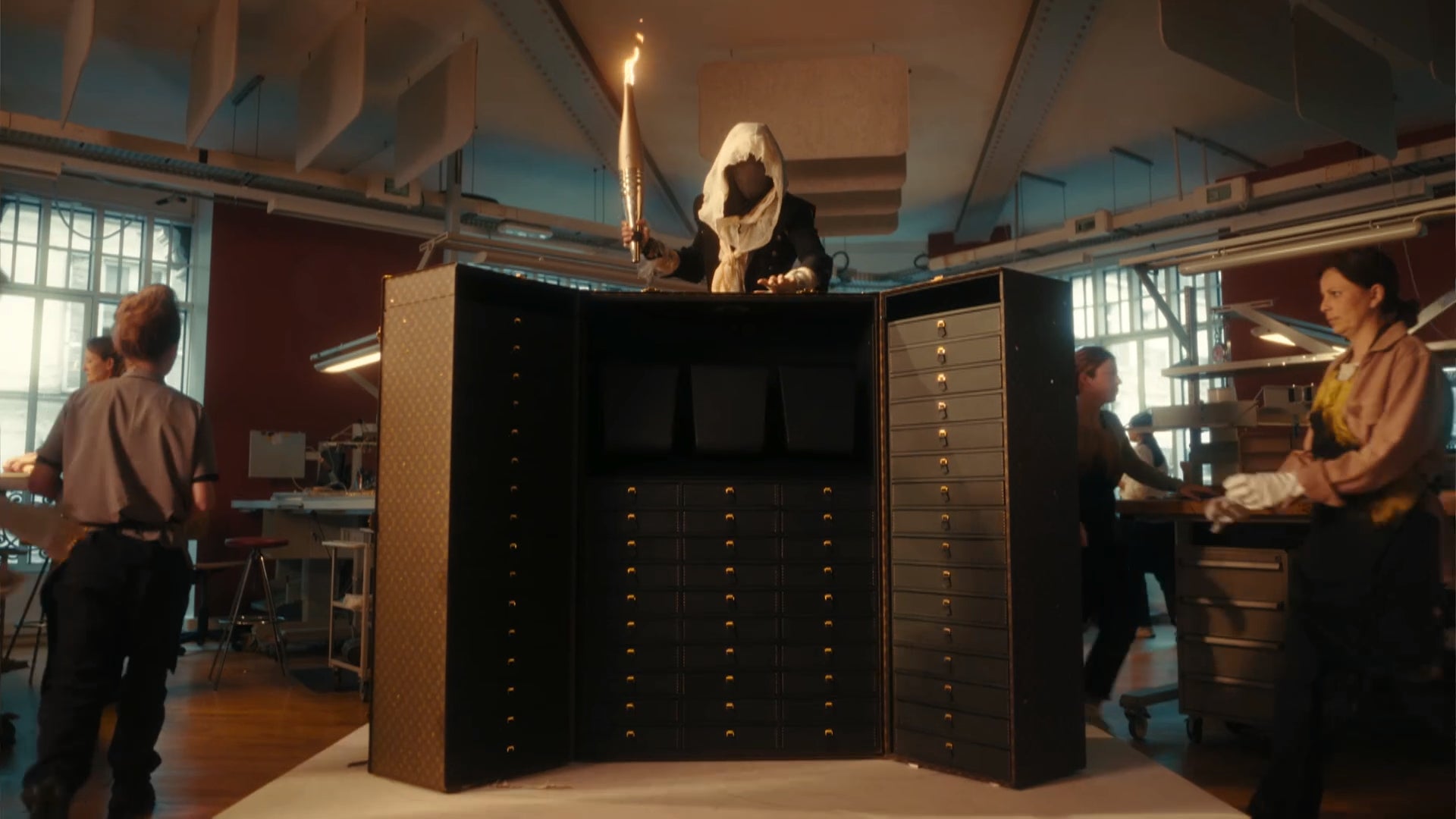 この驚くべき演出はオリンピック精神とルイ・ヴィトンに共通する、卓越性やパフォーマンス、クリエイティビティといった価値観に心からオマージュを捧げるもの。ポンヌフ通りにあるルイ・ヴィトン本社の屋上からはじまり、マスクを着けた聖火ランナーがメゾンのアトリエを颯爽と巡る大胆なストーリーでした。卓越したサヴォアフェール(匠の技)から生まれるアートである、ルイ・ヴィトンのメダル・トランクの製造過程が、アクロバットと卓越した技術によって順を追って紹介されたのです。