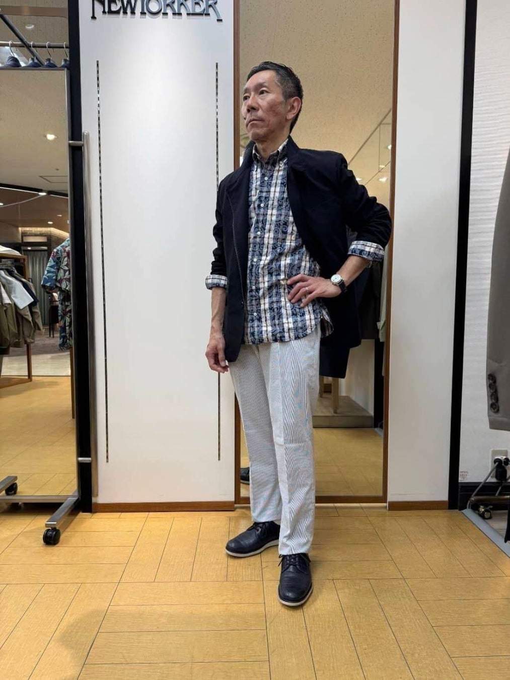 印象的なペイズリーニューヨーカータータンチェックのシャツに、軽やかなサックスのパンツを合わせた初夏にぴったりのコーディネート。ネイビーのライトアウターが全体を引き締め、上品さをプラスしています。足元はブラックのシューズでシックにまとめ、大人の落ち着きと清涼感を両立しました。