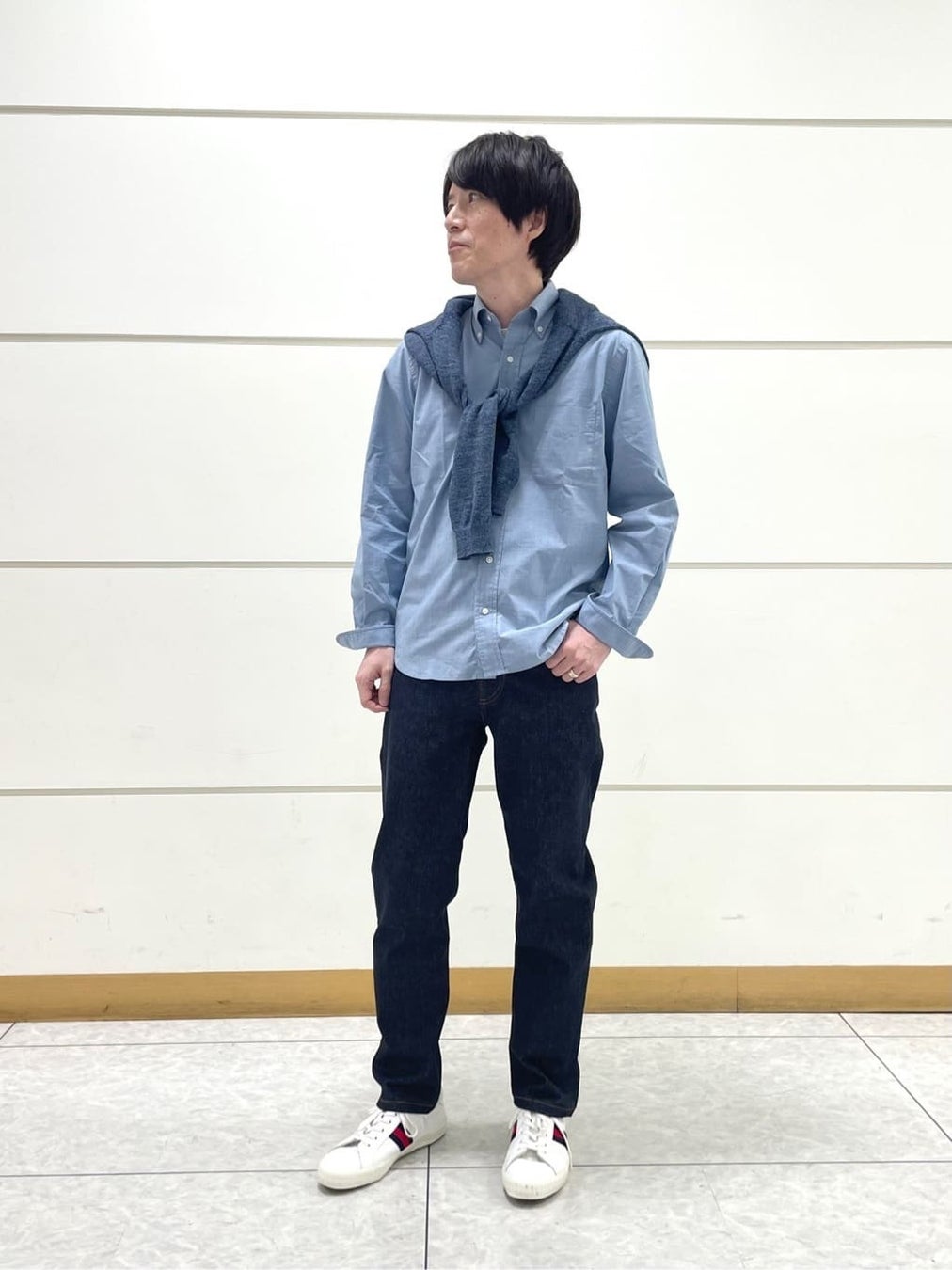 爽やかなブルーのボタンダウンシャツに、同系色のニットを肩掛けしてアクセントを加えた、定番ブルーシャツスタイル。シンプルながらもこなれ感を演出しました。ボトムスはダークトーンのテーパードデニムで引き締め、足元は白スニーカーで抜け感をプラス。クリーンかつカジュアルな大人のデイリーコーデです。ちょっとしたお出かけ、旅行にも最適ですよ。