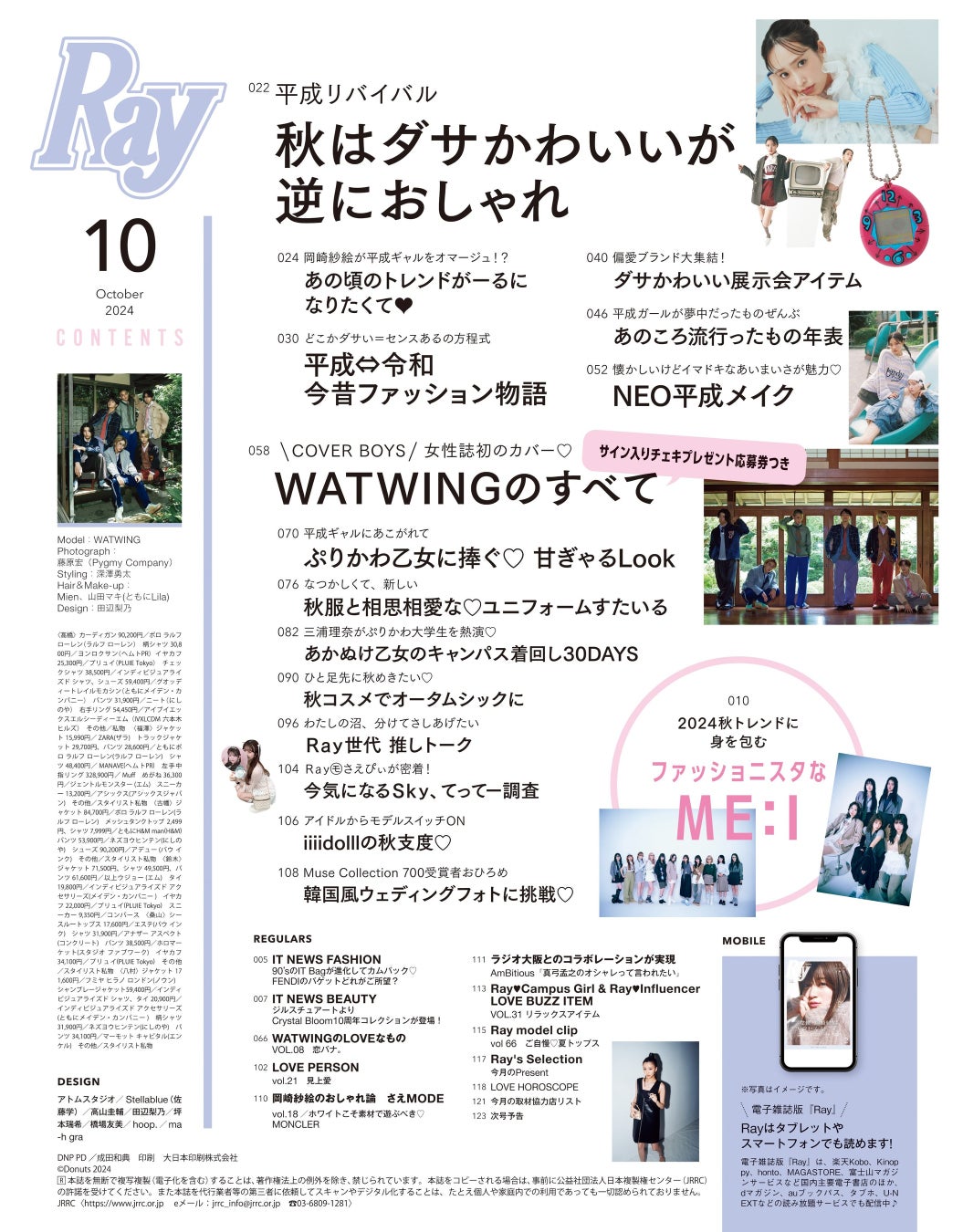 2024年8月22日(木)に発売する『Ray』2024年10月号の通常版表紙はME:I、特別版表紙はWATWINGがそれぞれ務めます。ダサかわいいの黄金比を実現させる平成リバイバル特集など、今秋のトレンドをご紹介します。