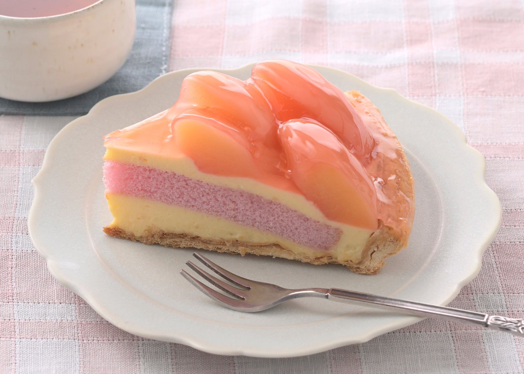 白桃と相性のよいピーチヨーグルト風味クリームと白桃ゼリーをふんわりスポンジでサンドし、上面に追熟白桃のコンポートを飾りました。