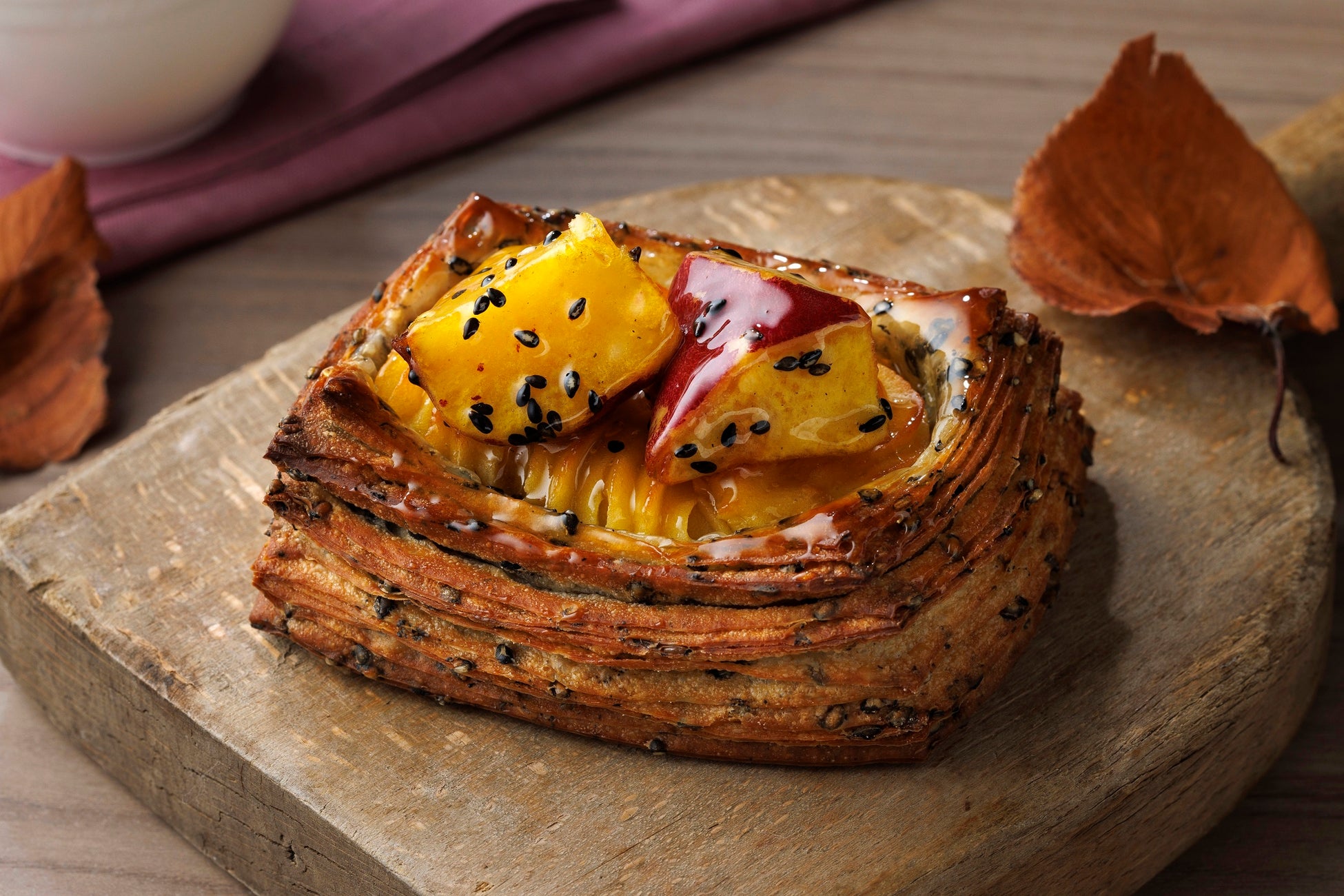 蜜がけさつまいもと、スイートポテトの2種を一緒に味わえるパイ。繊細なパイ生地の軽い食感と黒ごまの香ばしさとのコンビネーションが、さつまいもの甘さに立体感を生み出しています。